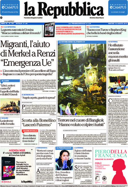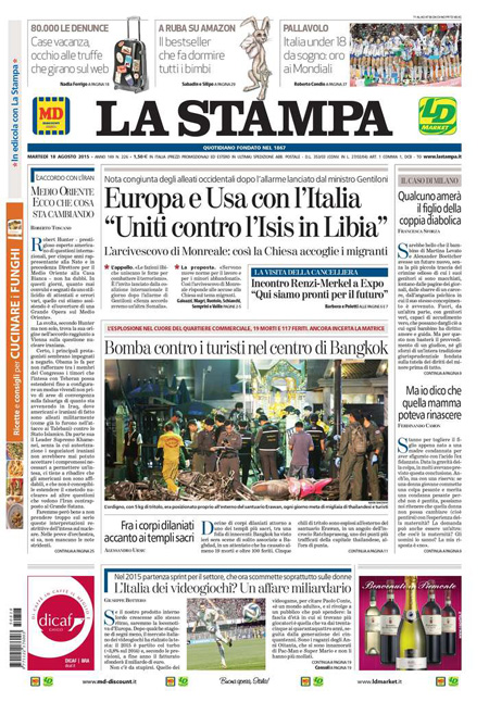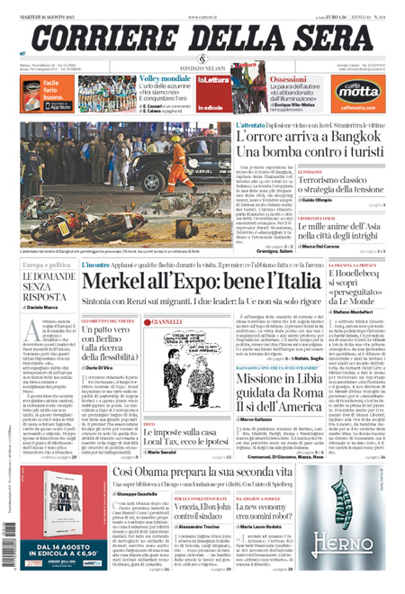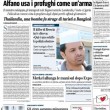 ROMA – Sulle prime pagine dei giornali di oggi 18 luglio, si parla della bomba esplosa ieri pomeriggio a Bangkok uccidendo 22 persone nei pressi di un famoso tempio induista a un trafficato incrocio cittadino. Per ora l’attentato non è stato rivendicato e le indagini in corso non hanno stabilito chi possa avere messo la bomba.