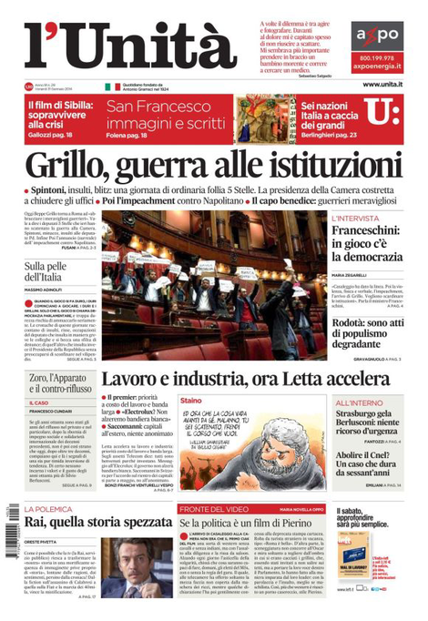Se riesce, l’accordo sulla riforma elettorale e su quelle istituzionali può ricreare un simulacro di unità nazionale; e dunque permettere una stabilizzazione del sistema, che si intravede appena ma potrebbe garantire la stabilità. L’offensiva di Beppe Grillo contro il Quirinale nasce da questa consapevolezza. Più che sicuro della propria forza, il leader del Movimento 5 Stelle appare disperato dalla prospettiva di ritrovarsi ai margini di giochi che per gli altri partiti forse significano rilegittimazione; per lui la sconfitta e la certificazione dell’isolamento politico. Arriva a proporre la messa in stato d’accusa di Giorgio Napolitano e si precipita nella capitale dai suoi parlamentari perché fiuta la diaspora interna.
