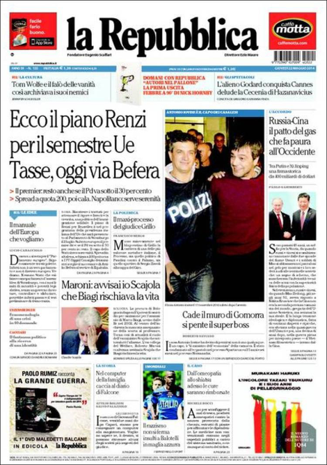 La prima pagina de La Repubblica: “Ecco il piano Renzi per il semestre Ue. Tasse, oggi via Befera”.