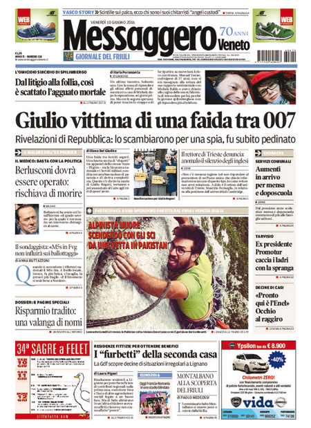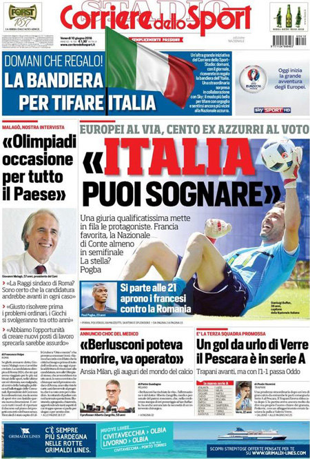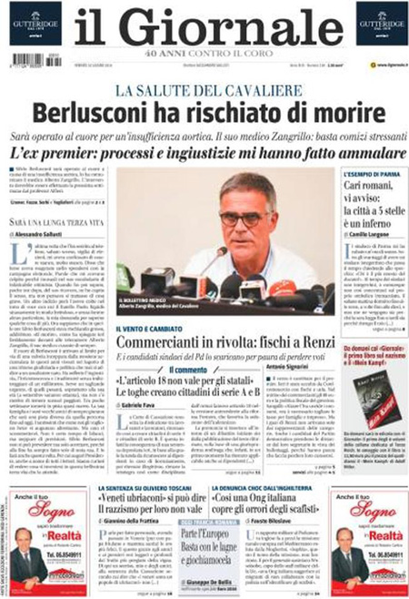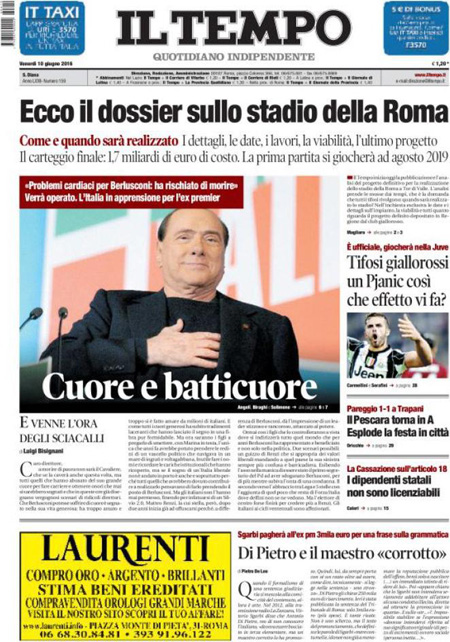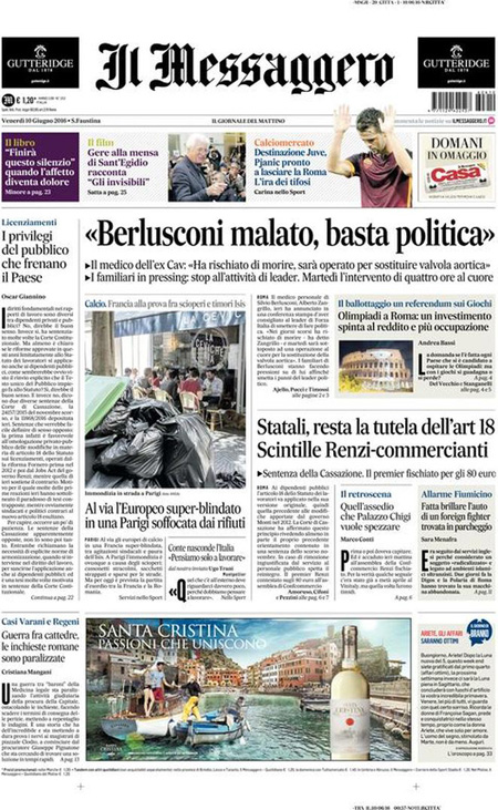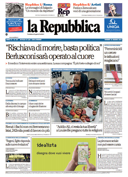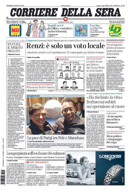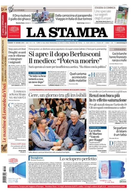 ROMA – Queste le prime pagine dei giornali di venerdรฌ 10 giugno. La prima pagina de La Stampa: “Si apre il dopo Berlusconi. Il medico: poteva morire”. La prima pagina del Corriere della Sera: “Renzi: รจ solo un voto locale”. La prima pagina de La Repubblica: “Berlusconi sarร operato al cuore: rischiava di morire, basta politica”.