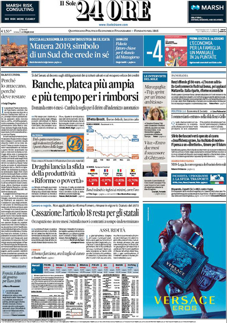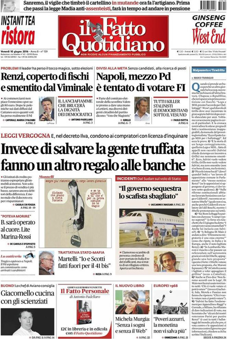 La prima pagina del Sole 24 Ore: “Banche, platea piรน ampia e piรน tempo per i rimborsi”. Il Giornale: “Berlusconi ha rischiato di morire”. La prima pagina di Libero: “Salvate il soldato Silvio”.ย Queste le prime pagine dei giornali di venerdรฌ 10 giugno.