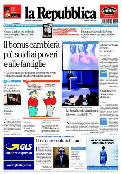 Il Corriere della Sera apre con un sondaggio sulle elezioni europee, Repubblica con le novità riguardo il bonus Irpef, il Giornale titola “illegale l’inchiesta Ruby”, altri con la fiducia sul decreto lavoro.