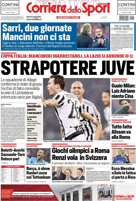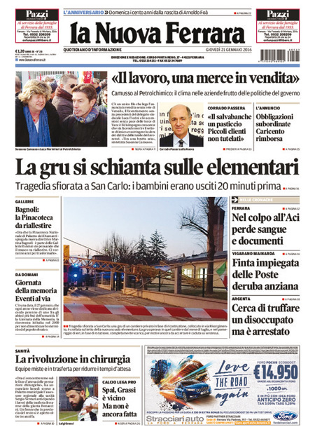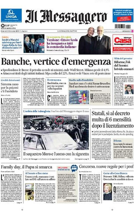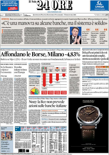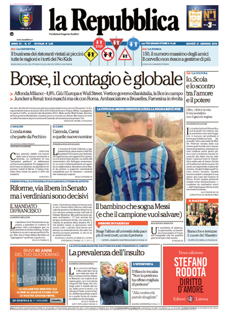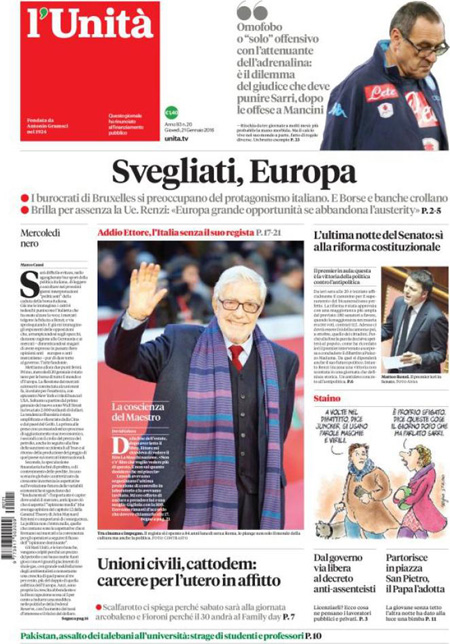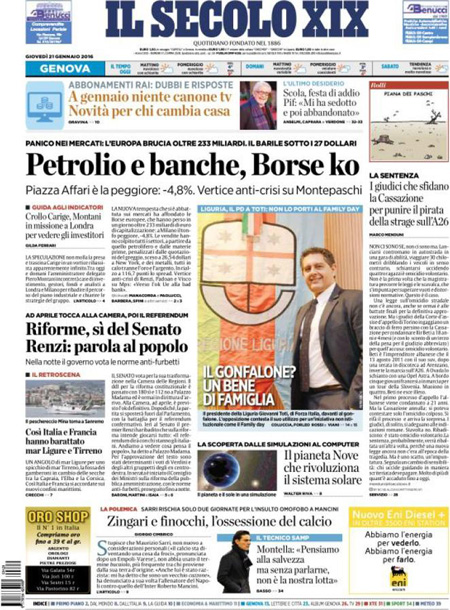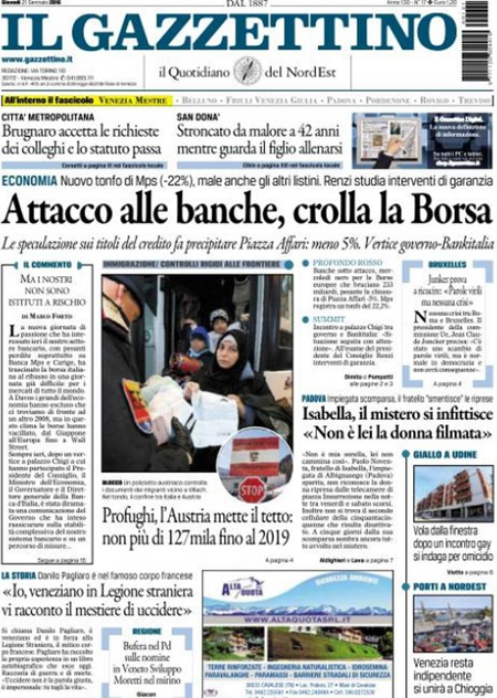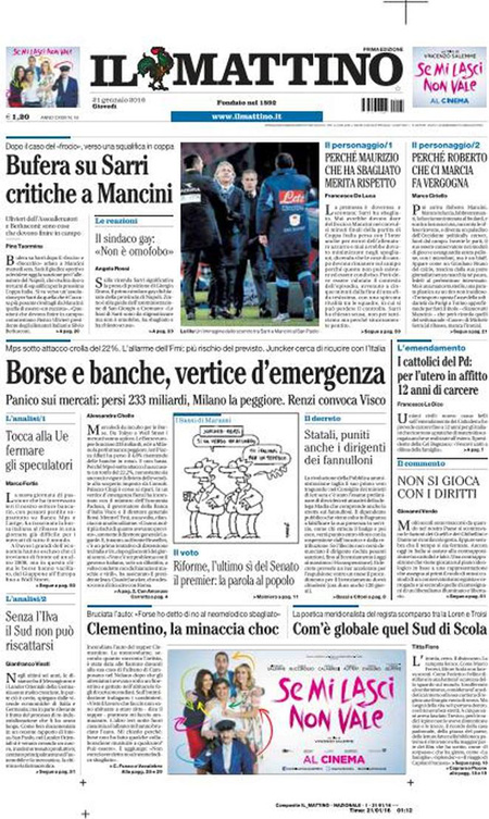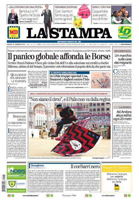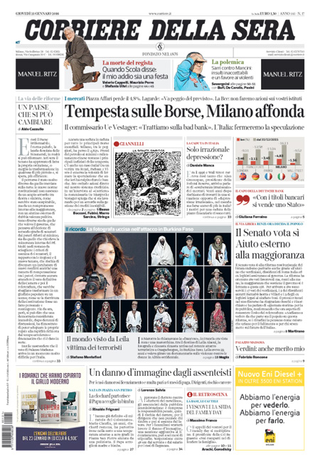 ROMA – Queste le prime pagine dei giornali di giovedì 21 gennaio. La prima pagina della Stampa: “Il panico globale affonda le Borse. Vertice Renzi-Padoan-Visco: più vicino l’ok dell’Ue alla soluzione sui crediti a rischio”. La prima pagina del Corriere della Sera: “Tempesta sulle Borse, Milano affonda”. La prima pagina di Repubblica: “Borse, il contagio è globale. Affonda Milano. Giù l’Europa e Wall Street. Vertice governo-Bankitalia, la Bce in campo”. La prima pagina del Sole 24 Ore: “Affondano le Borse, Milano -4,83%”. La prima pagina del Messaggero: “Banche, vertice d’emergenza. Sprofondano le Borse: il petrolio scende ai minimi, cade Wall Street”.
