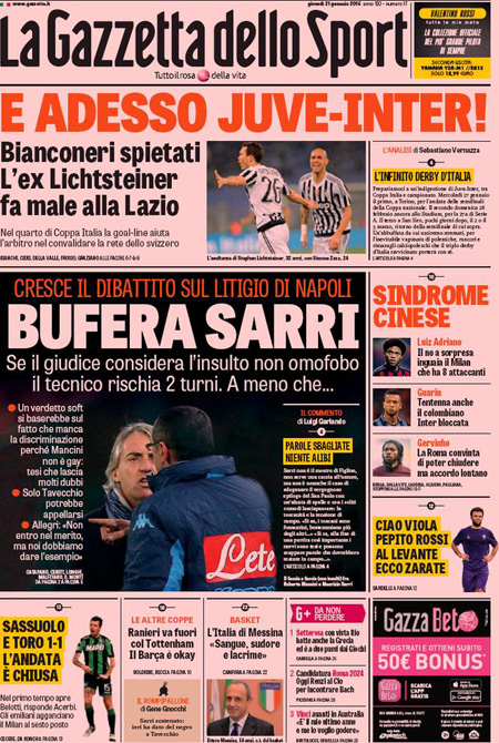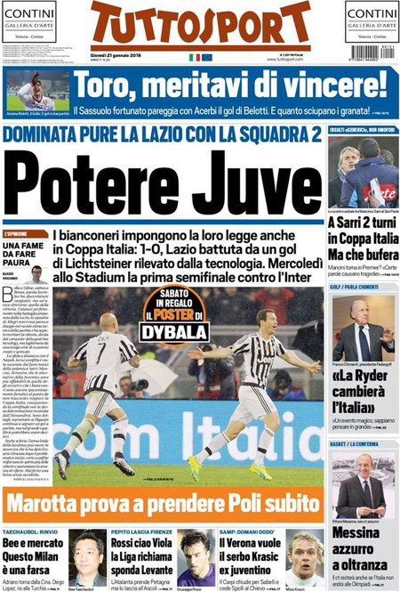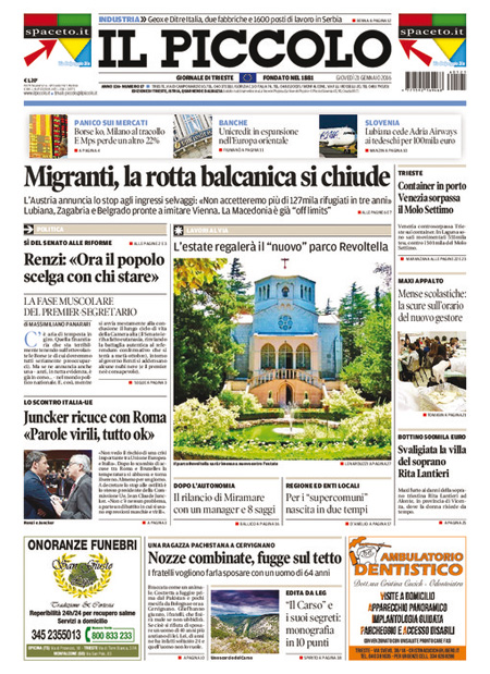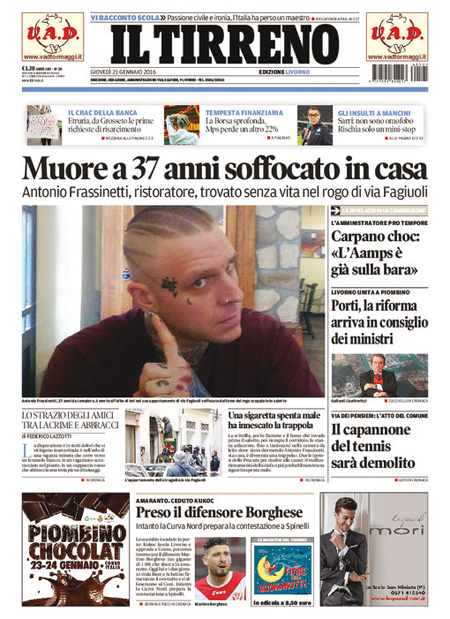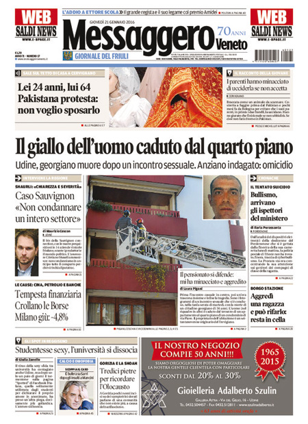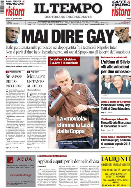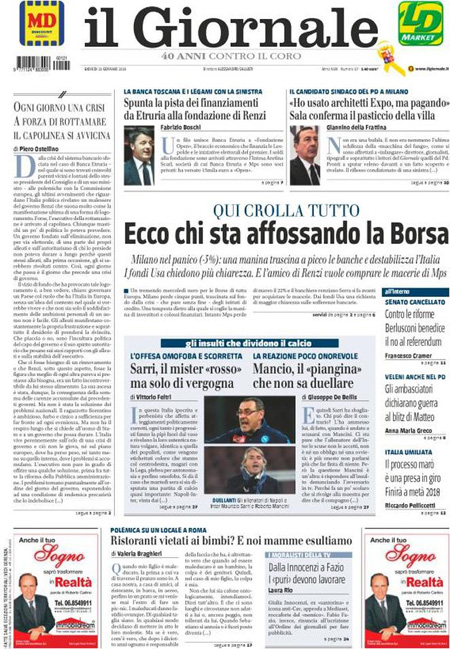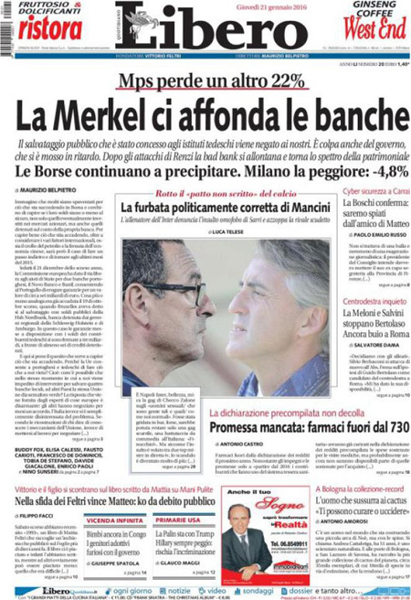 La prima pagina del Giornale: “Qui crolla tutto. Ecco chi sta affossando la Borsa. Milano nel panico: una manina trascina a picco le banche e destabilizza l’Italia”. La prima pagina del Fatto Quotidiano: “Mps travolge Borse e governo”. La prima pagina di Libero: “Mps perde un altro 22%. La Merkel ci affonda le banche. Il salvataggio pubblico che è stato concesso agli istituti tedeschi viene negato ai nostri. E’ colpa anche del governo, che si è mosso in ritardo”. La prima pagina del Tempo: “Mai dire gay. Italia paralizzata sulle parolacce”. Queste le prime pagine dei giornali di giovedì 21 gennaio.