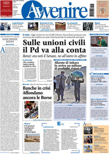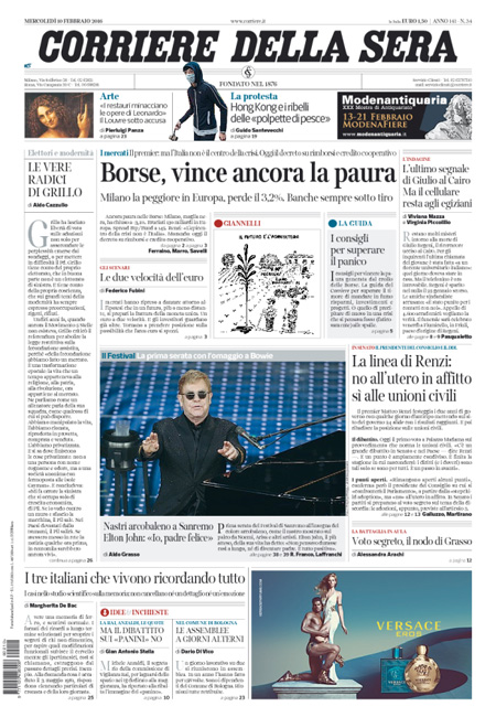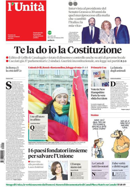 ROMA – Queste le prime pagine dei giornali di mercoledì 10 febbraio. La prima pagina de La Stampa: “Banche italiane, la grande paura. In 40 giorni bruciati 40 miliardi. Il premier: ma non siamo l’epicentro della tempesta finanziaria”. La prima pagina del Corriere della Sera: “Borse, vince ancora la paura. Milano la peggiore in Europa. Banche sempre sotto tiro”. La prima pagina de La Repubblica: “Unioni, voto verità. Renzi: ma dico no all’utero in affitto. Legge in aula, il premier: basta nascondersi”. La prima pagina del Sole 24 Ore: “La crisi scuote Borse e tassi”.