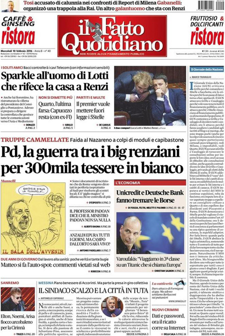 La prima pagina del Messaggero: “Borse, allarme banche centrali. Fed e Bce pronte a intervenire per arginare il crollo dei mercati e stimolare l’economia”. La prima pagina del Giornale: “Fisco disumano. Scandalo Equitalia, in 15 anni 217 miliardi di cartelle false. Crolla ancora la Borsa, soldi in fumo e Renzi latita”. La prima pagina del Fatto Quotidiano: “Pd, la guerra tra big renziani per 300mila tessere in bianco”. La prima pagina di Libero: “In fumo metà del debito pubblico. Mille miliardi di euro regalati agli evasori”. La prima pagina del Tempo: “Ma questi stanno Forum. Tutti i sondaggi danno il centrodestra unito vincente a Roma. I leader litigano e la Meloni candida la presentatrice Dalla Chiesa”.
