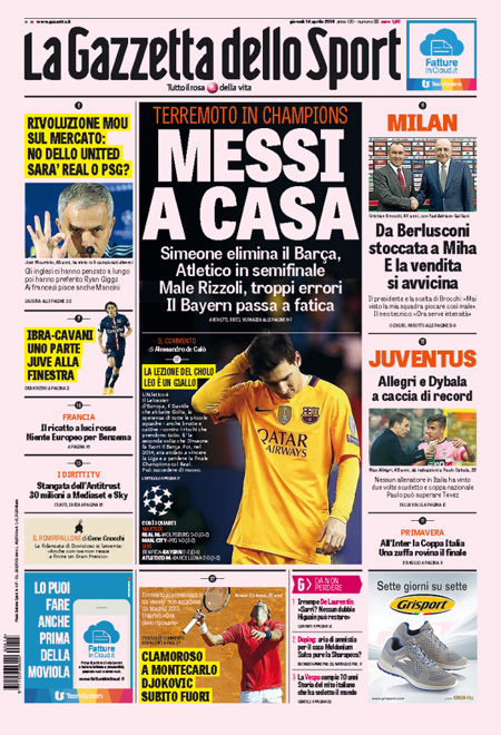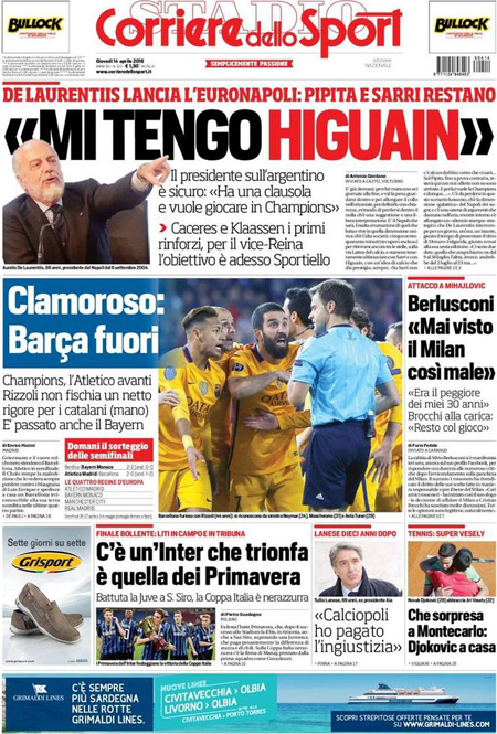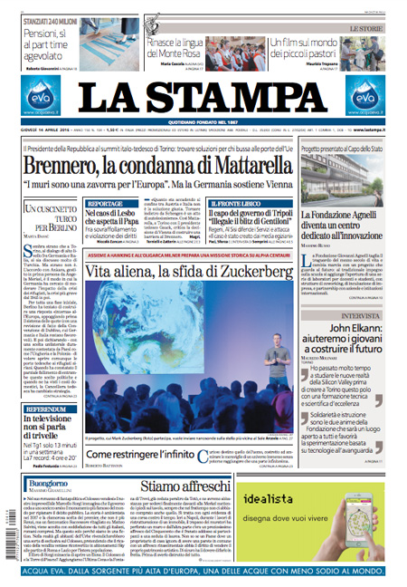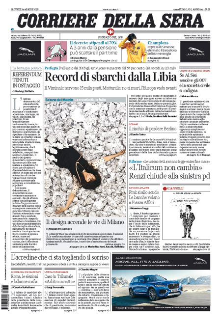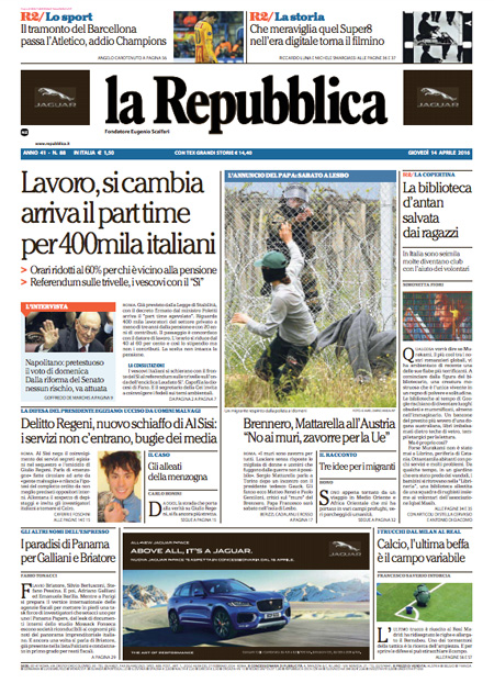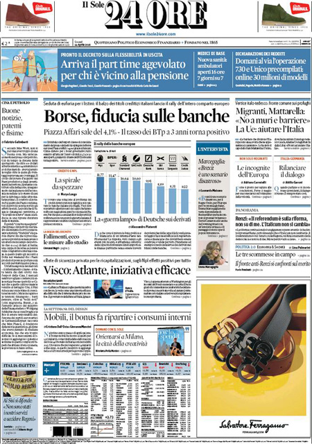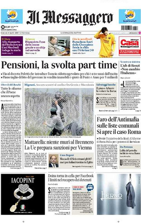 ROMA – Queste le prime pagine di giovedรฌ 14 aprile. La prima pagina de La Stampa: “Brennero, la condanna di Mattarella: i muri sono una zavorra per l’Europa”. La prima pagina del Corriere della Sera: “Record di sbarchi dalla Libia. Il Viminale: servono 15mila posti”. La prima pagina de La Repubblica: “Lavoro, si cambia. Arriva il part time per 400mila italiani. Orari ridotti al 60% per chi รจ vicino alla pensione”. La prima pagina del Sole 24 Ore: “Borse, fiducia sulle banche”. La prima pagina del Messaggero: “Pensioni, la svolta part time. Via al decreto Poletti che introduce l’orario ridotto agevolato per chi รจ a 3 anni dall’uscita”.