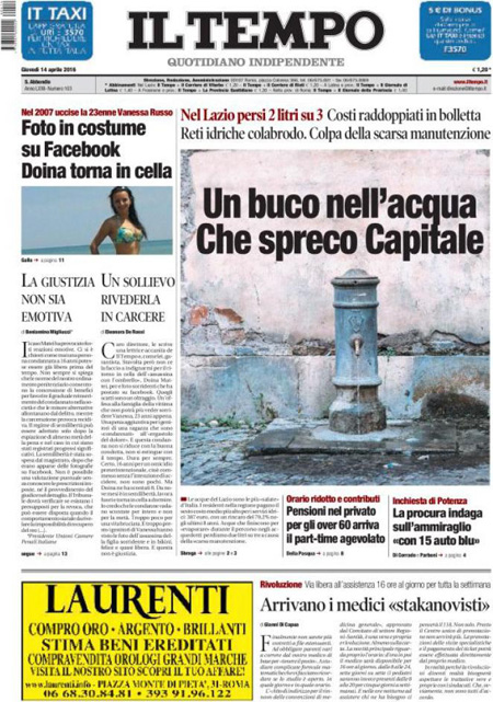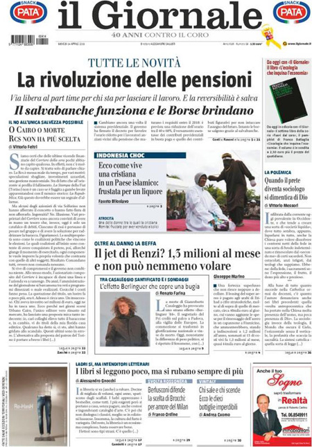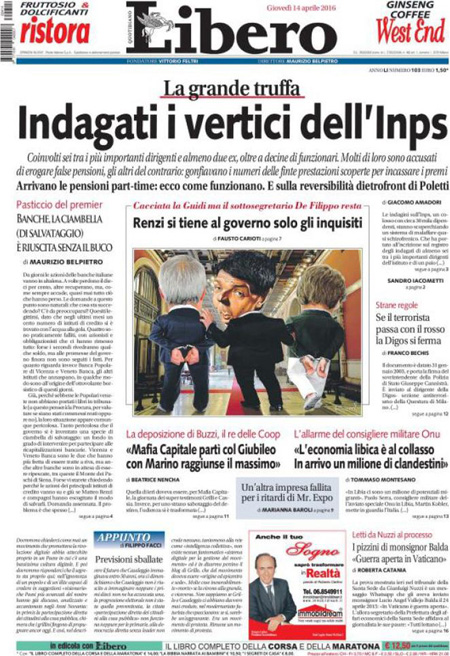La prima pagina del Giornale: “La rivoluzione delle pensioni. Via libera al part time per chi sta per lasciare il lavoro”. La prima pagina di Libero: “La grande truffa. Indagati i vertici dell’Inps”. La prima pagina del Fatto Quotidiano: “La trivella avvelena la Sicilia: il governo le proroga i permessi”.ย Queste le prime pagine di giovedรฌ 14 aprile.