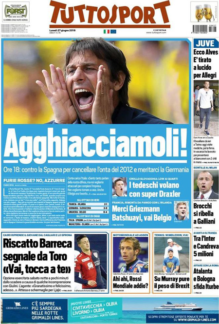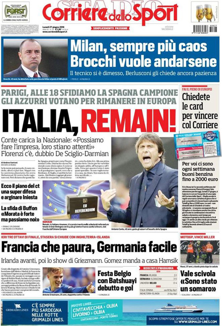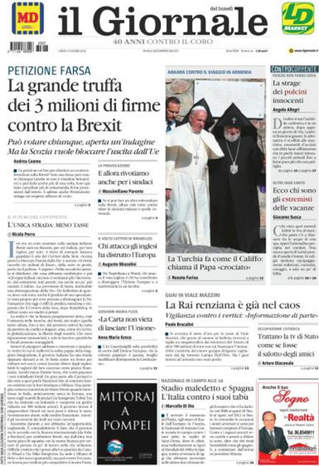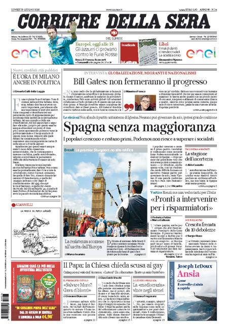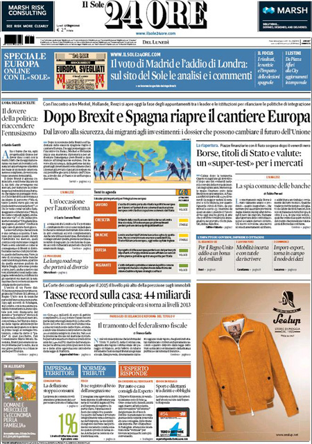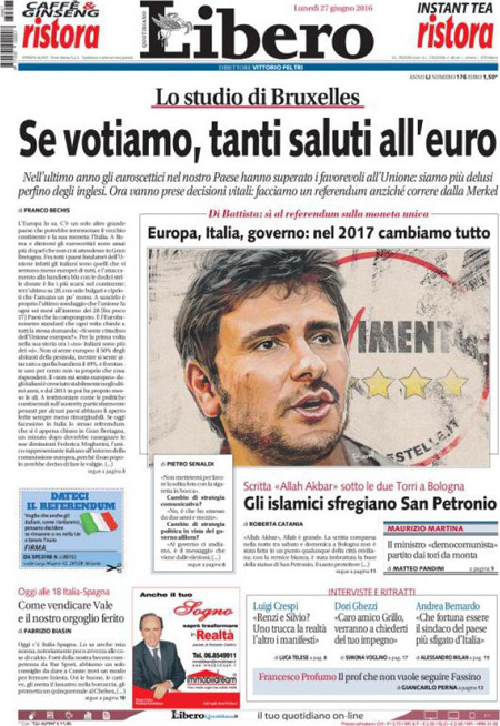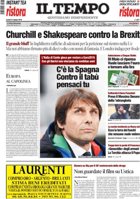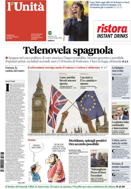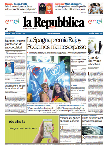 La prima pagina de La Repubblica: “La Spagna premia Rajoy. Podemos, niente sorpasso”. La prima pagina del Sole 24 Ore: “Dopo Brexit e Spagna riapre il cantiere Europa”. La prima pagina del Messaggero: “Spagna, non c’รจ l’effetto Brexit”. La prima pagina del Giornale: “La grande truffa dei 3 milioni di firme contro la Brexit”. La prima pagina di Libero: “Se votiamo, tanti saluti all’Euro”.ย Queste le prime pagine dei giornali di lunedรฌ 27 giugno.