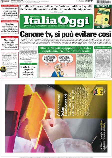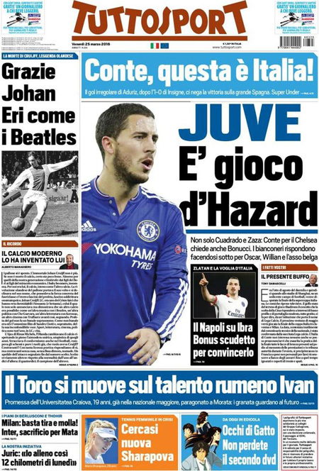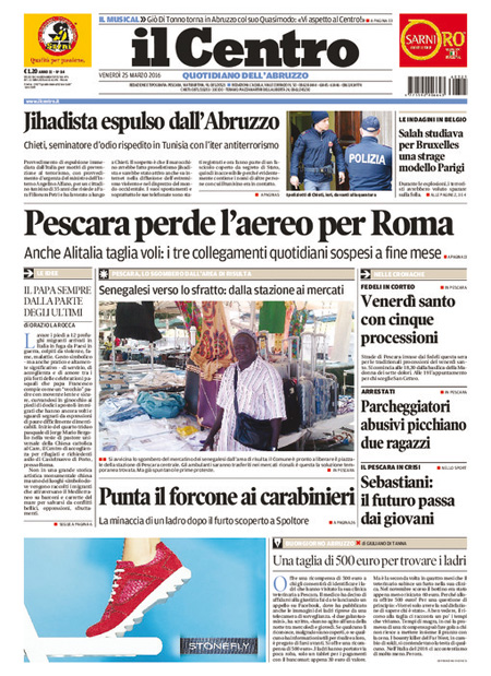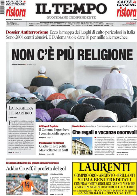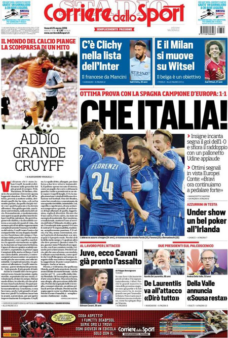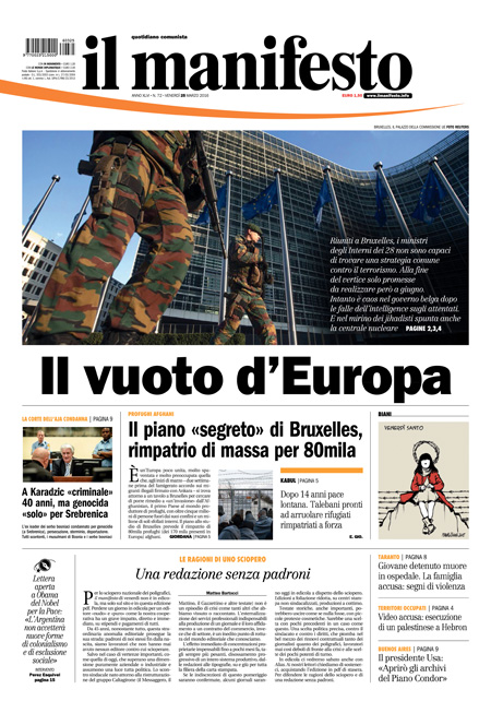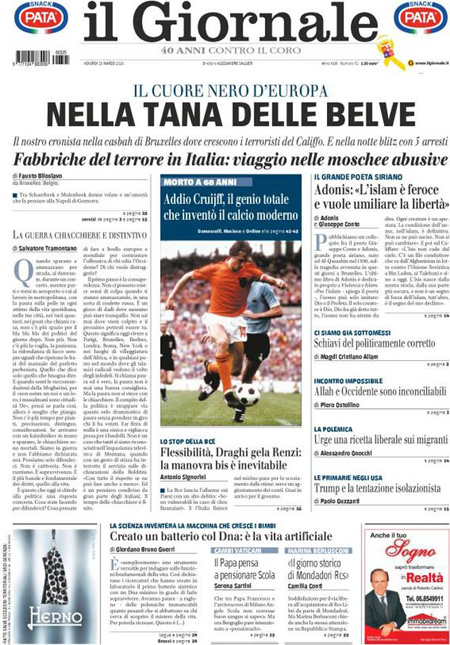 ROMA – I giornali che escono oggi, 25 marzo, sono pochi per lo sciopero nazionale dei poligrafici, e i titoli in prima pagina si occupano delle indagini sugli attentati di Bruxelles, delle reazioni decise dalle autorità europee, e dei timori per la diffusione in Italia del terrorismo islamista, mentre i giornali sportivi ricordano Johan Cruijff e commentano il pareggio in amichevole dell’Italia, con una buona prestazione contro la Spagna.