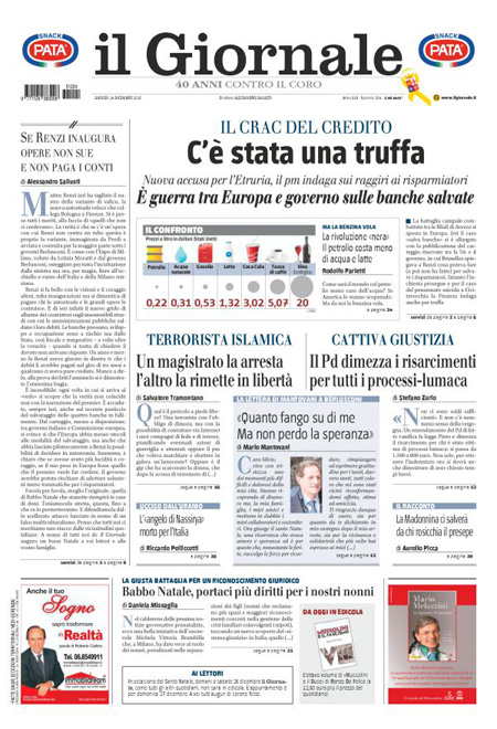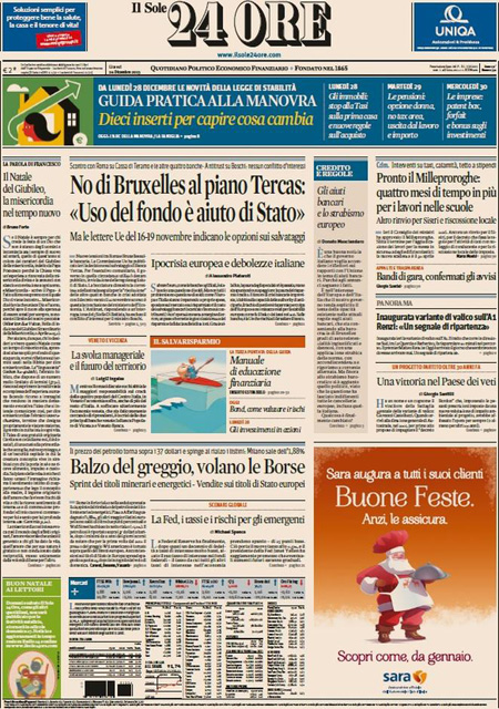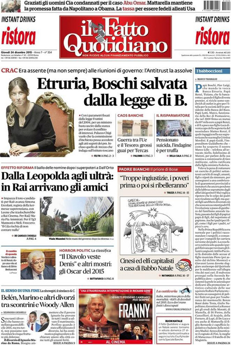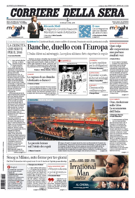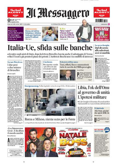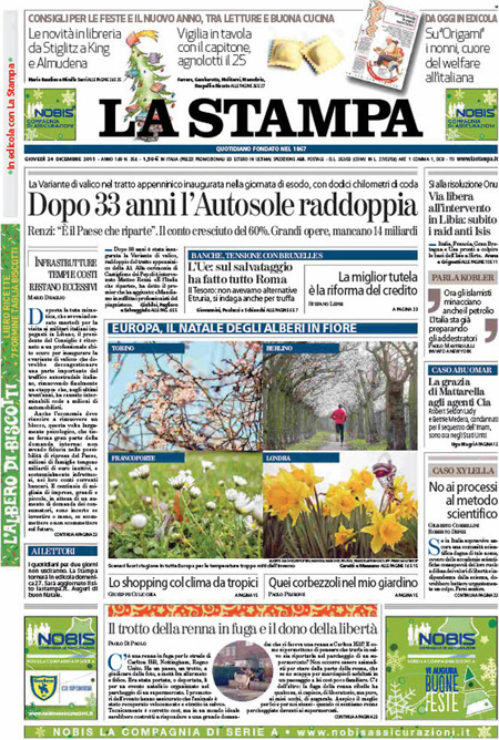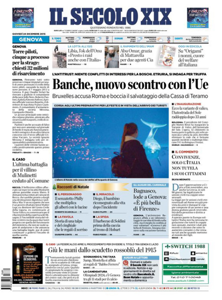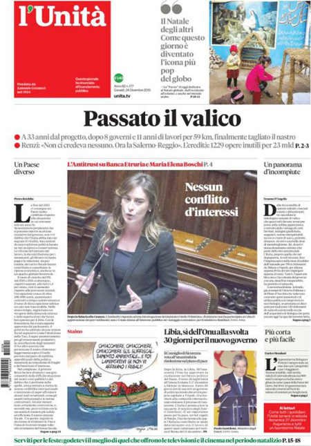 ROMA – L’apertura dei giornali di oggi, 24 dicembre, è dedicata a notizie diverse: molti si occupano ancora di banche, con la bocciatura da parte dell’Unione Europea del salvataggio di Tercas, la banca di Teramo, e l’assoluzione dell’Antitrust per il ministro Boschi dal conflitto di interessi su Banca Etruria. La Stampa, il Tempo e l’Unità titolano invece sull’apertura della variante di valico dell’autostrada del sole.