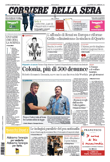 ROMA – Le prime pagine dei giornali di lunedì 11 gennaio. La prima pagina della Stampa: “Gas, Putin chiede aiuto a Renzi. Il Presidente russo ha bisogno che l’Italia entri in Nord Stream per superare le obiezioni di monopolio della Ue. Mentre Roma è allo sprint nella corsa a un seggio nel Consiglio di Sicurezza Onu”. La prima pagina del Corriere della Sera: “Colonia, più di 500 denunce. Molestie di massa in Germania, nuovo caso in una discoteca della Westfalia”. La prima pagina de La Repubblica: “Colonia, attacco pianificato. Molestate la donna bianca. Il governo tedesco: branco nato online. Colpite 12 città e una discoteca”.