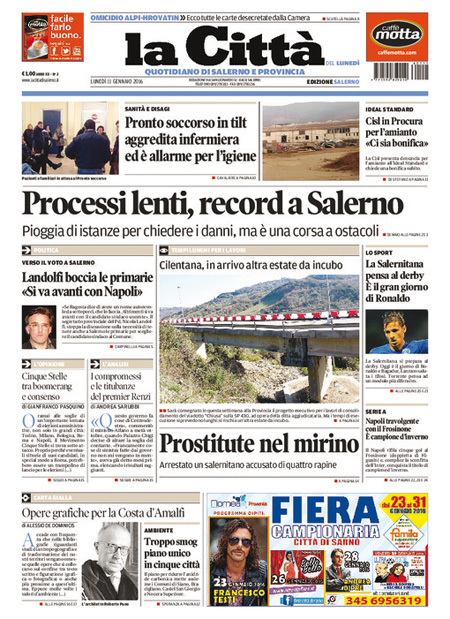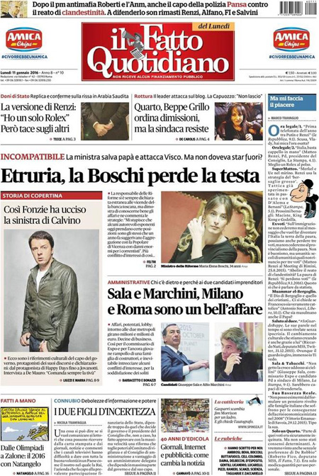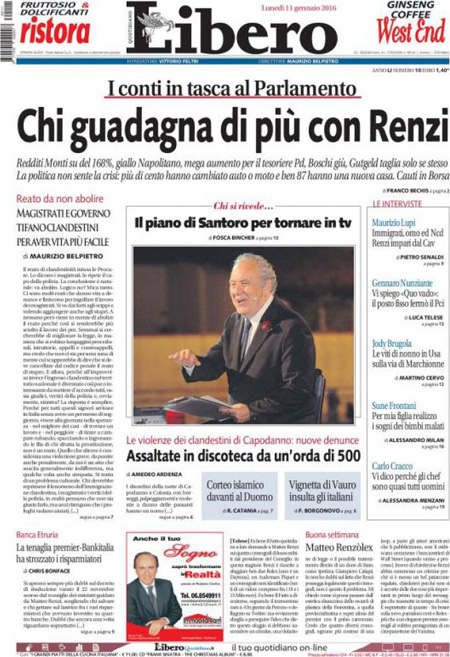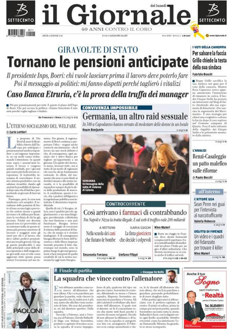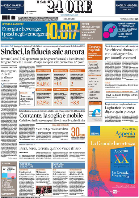 La prima pagina del Sole 24 Ore: “Sindaci, la fiducia sale ancora”. La prima pagina del Messaggero: “Droghe leggere, nuovo caso. Depenalizzazioni, grana nel governo: la coltivazione della cannabis illecito amministrativo”. La prima pagina del Giornale: “Tornano le pensioni anticipate. Il presidente Inps, Boeri: chi vuole lasciare prima il lavoro deve poterlo fare”. La prima pagina di Libero: “I conti in tasca al Parlamento. Chi guadagna di più con Renzi”. La prima pagina del Tempo: “Referendum anche per le Olimpiadi. Torna la moda della consultazione popolare”. Queste le prime pagine dei giornali di lunedì 11 gennaio.