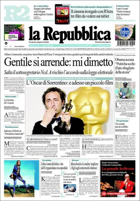La prima pagina di Repubblica: “Gentile si arrende: mi dimetto”.