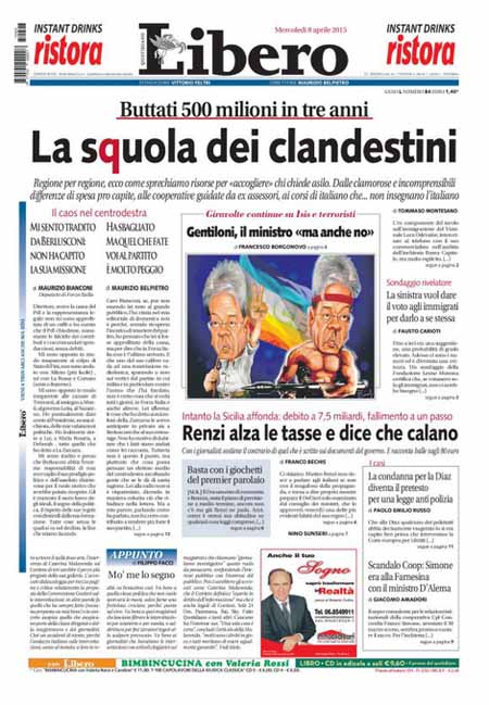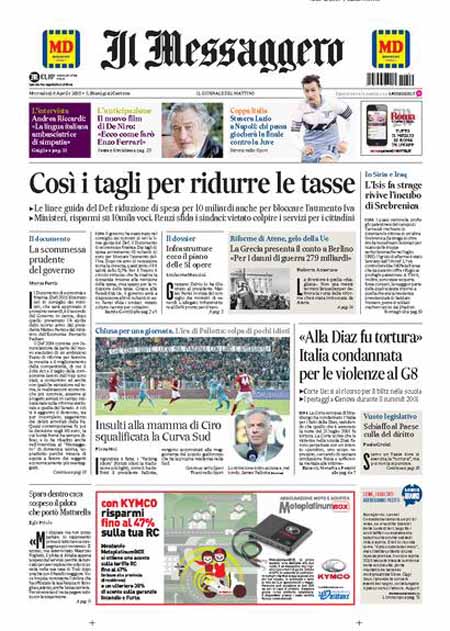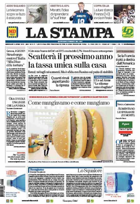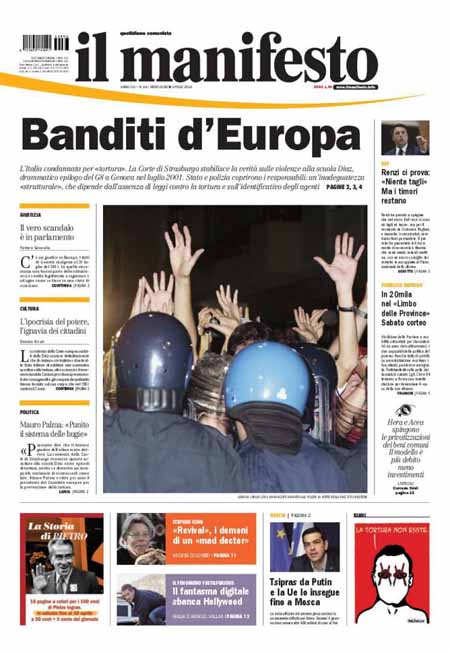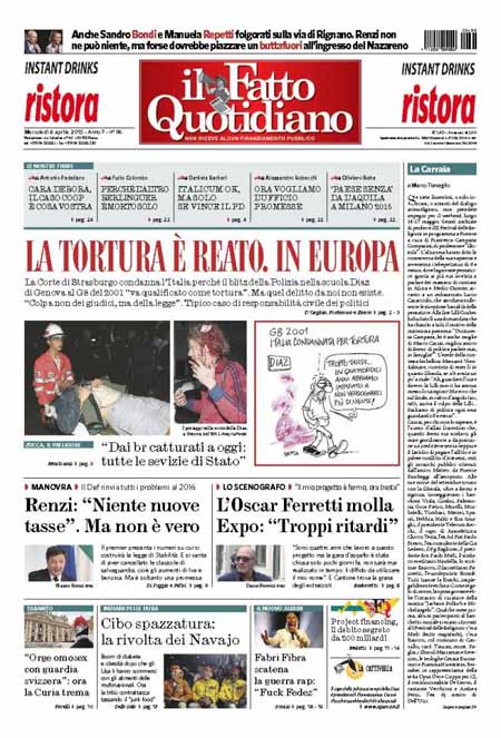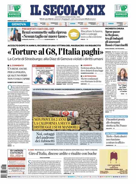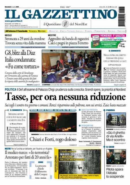 ROMA – Sono due le notizie principali sulle prime pagine dei giornali di oggi 8 aprile: la prima è la sentenza della Corte europea di Strasburgo contro l’Italia per quello che accadde dentro la scuola Diaz di Genova la notte del 21 luglio 2001, durante i giorni del G8. La seconda è l’esame del Documento di Economia e Finanza per il 2015 da parte del governo e le rassicurazioni del presidente del Consiglio Matteo Renzi sul fatto che “non ci saranno né nuovi tagli né nuove tasse”.