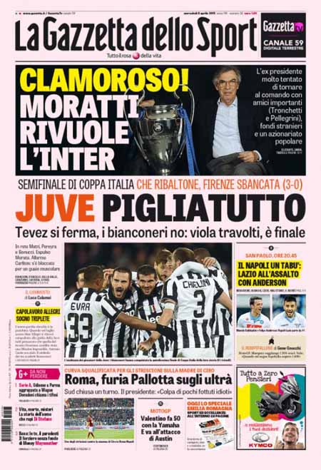 Sui giornali sportivi la notizia è la vittoria della Juventus, che ha battuto 0-3 la Fiorentina in trasferta ribaltando la semifinale di andata di Coppa Italia e qualificandosi così alla finale.