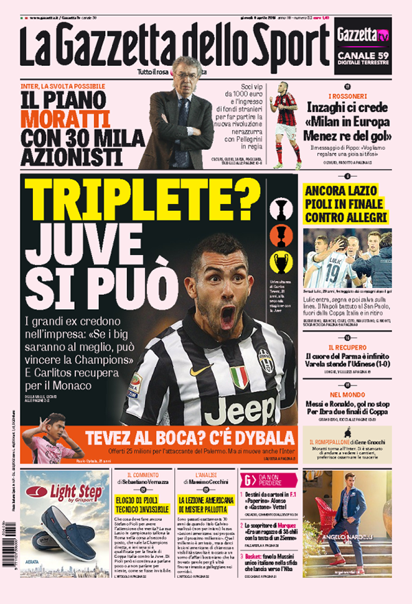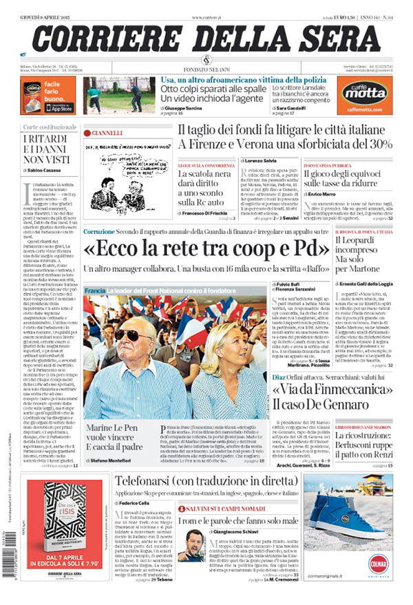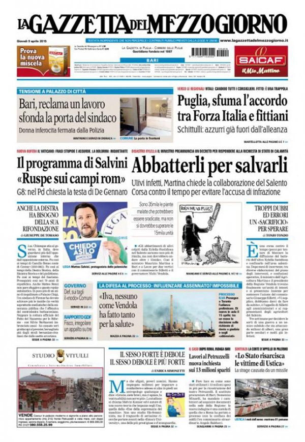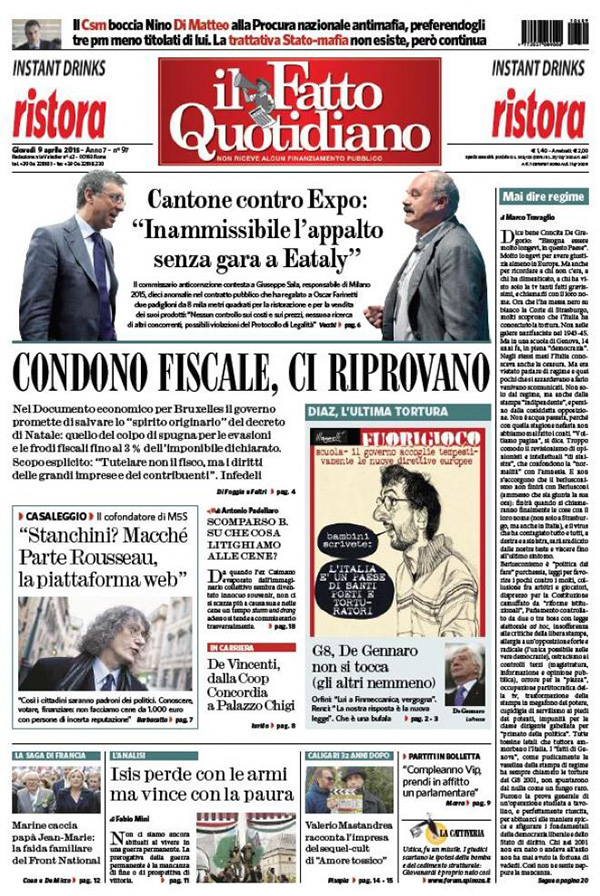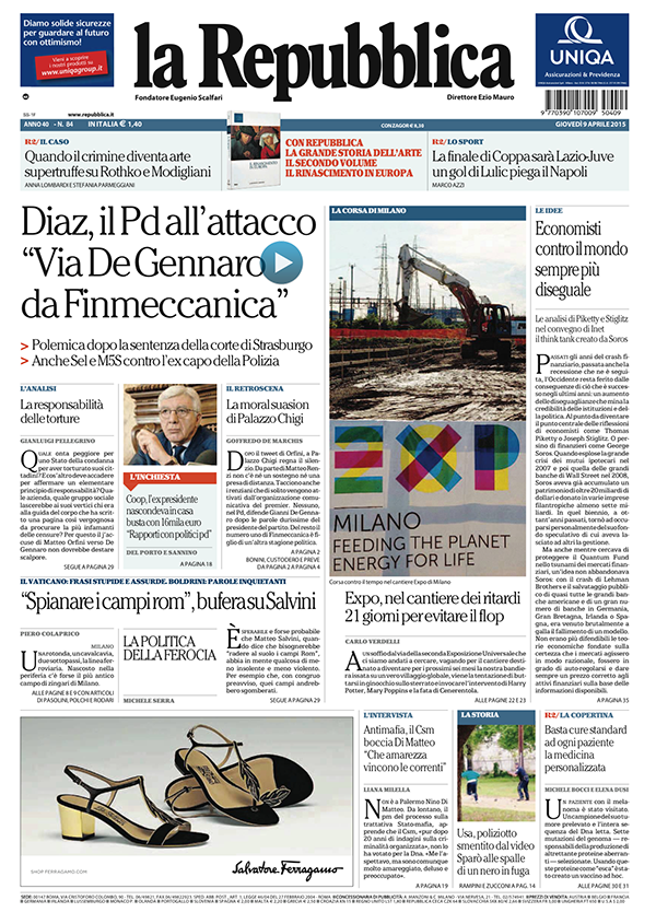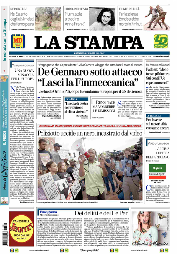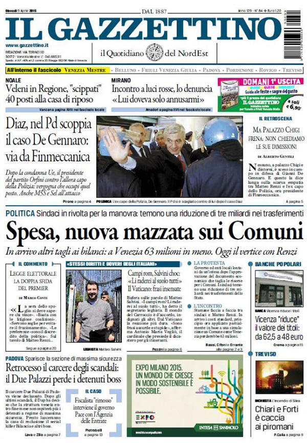 ROMA – Le prime pagine dei giornali di oggi, giovedì 9 aprile, danno spazio alle polemiche all’interno del Pd sul ruolo di Gianni De Gennaro, attuale presidente di Finmeccanica, nelle violenze di polizia ai tempi del G8 di Genova. Trovano spazio le parole di Matteo Salvini sui campi rom. I giornali sportivi mettono in prima pagina il risultato della semifinale di Coppa Italia tra Lazio e Napoli.