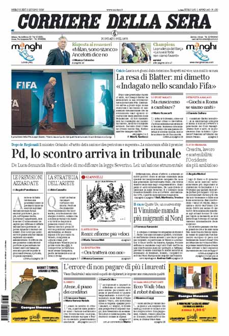 ROMA – Sulle prime pagine dei giornali di oggi, mercoledì 3 giugno, spazio alle dimissioni di Joseph Blatter da capo della FIFA, l’organismo che governa il calcio mondiale, a causa di una grossa inchiesta statunitense e alle conseguenze e gli strascichi delle elezioni amministrative di domenica scorsa, soprattutto relativamente all’elezione di Vincenzo De Luca in Campania, all’applicazione della cosiddetta legge Severino e alla questione “impresentabili”.
