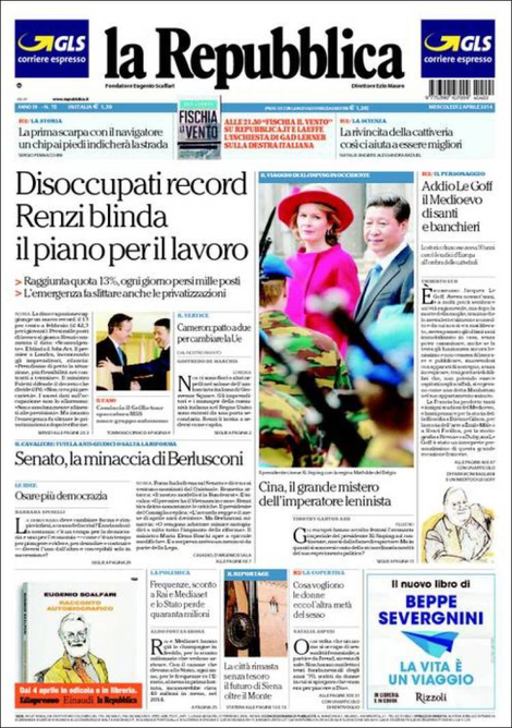 La prima pagina de La Repubblica: “Disoccupati record. Renzi blinda il piano per il lavoro”.