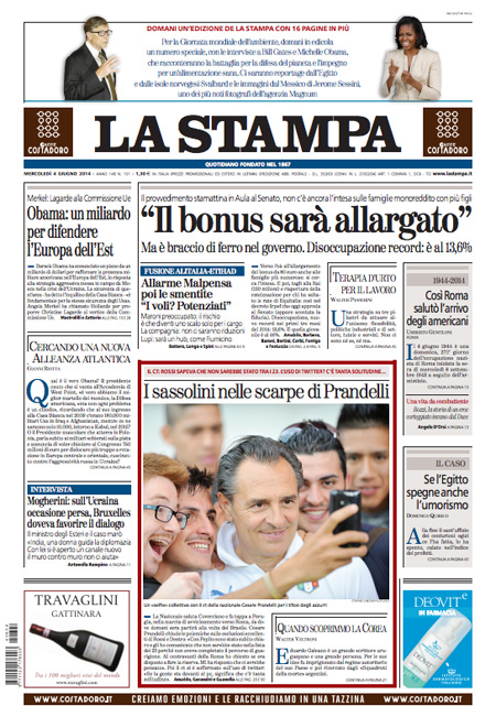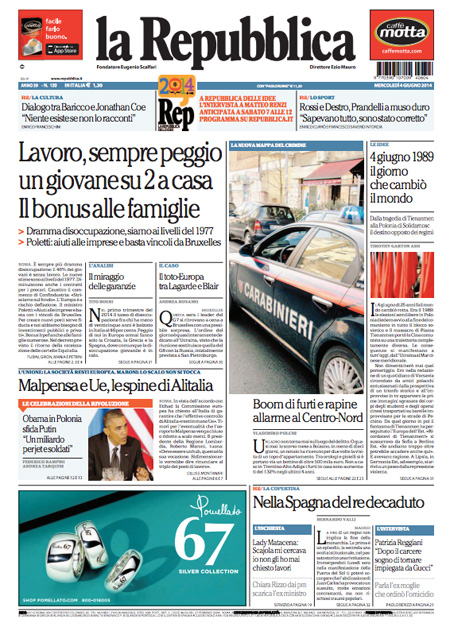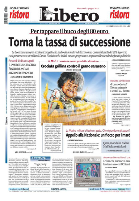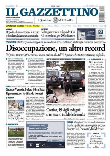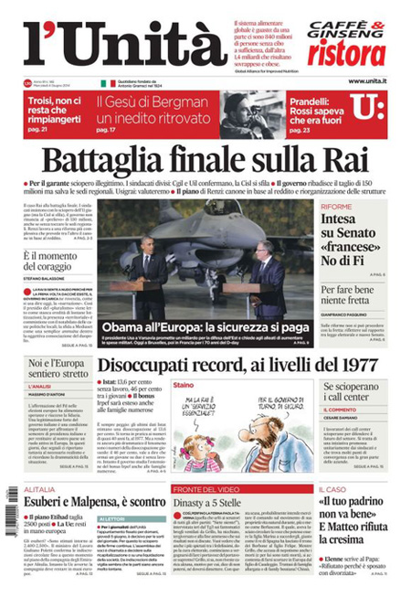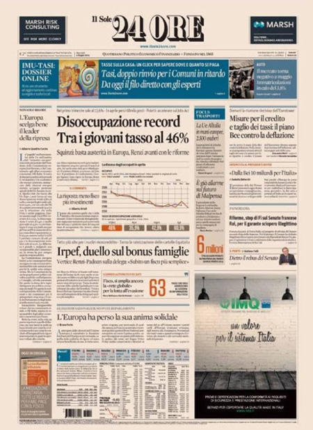 ROMA – La notizia che campeggia in apertura sui principali giornali di oggi è il nuovo dato comunicato dall’Istat sulla disoccupazione, giunta al livello record del 13,6%. A questa notizia è accostata anche la possibilità che venga esteso alle famiglie numerose il bonus da 80 euro, modificando il decreto all’esame oggi del Senato.