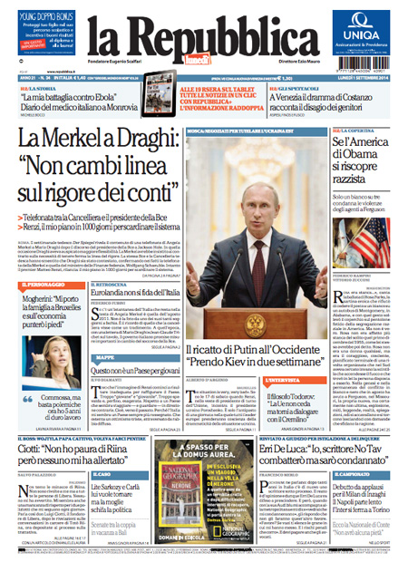 La prima pagina de La Repubblica: “La Merkel a Draghi: non cambi linea sul rigore dei conti”.