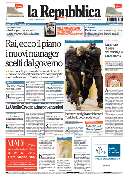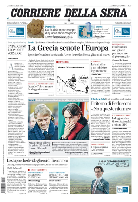 ROMA – Le prime pagine dei giornali di lunedì 9 marzo 2015. La Stampa: “Berlusconi dice no, Pd diviso. A rischio le riforme di Renzi”. Il Corriere della Sera: “La Grecia scuote l’Europa”. La Repubblica: “Rai, ecco il piano. I nuovi manager scelti dal governo”.