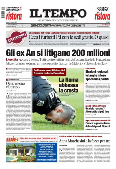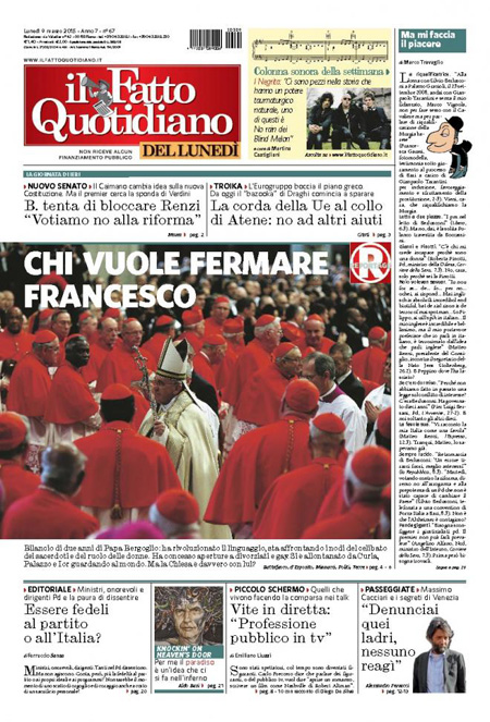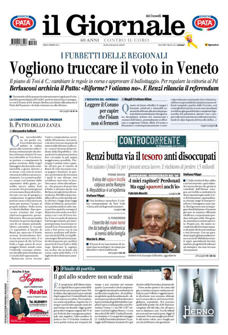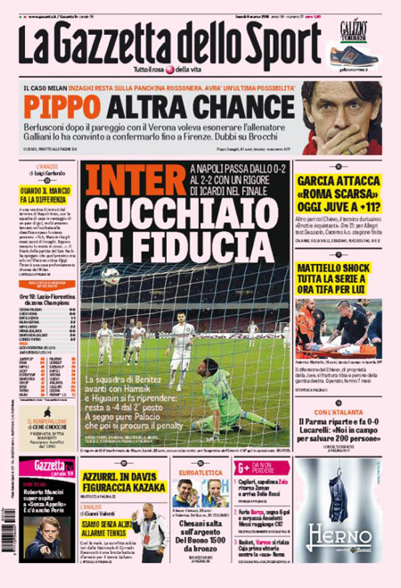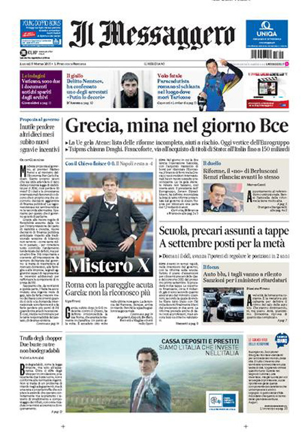 Il Messaggero: “Grecia mina nel giorno Bce”. Il Giornale: “I furbetti delle regionali. Vogliono truccare il voto in Veneto”. La Gazzetta dello Sport: “Inter, cucchiaio di fiducia”. Il Corriere dello Sport: “Follia Napoli. Impresa Inter”.