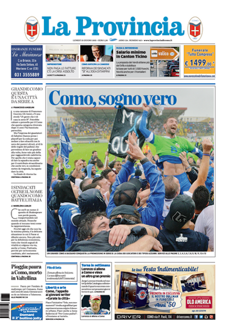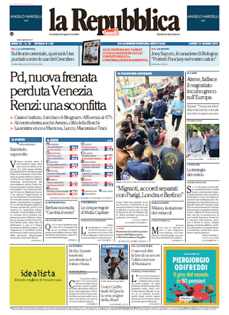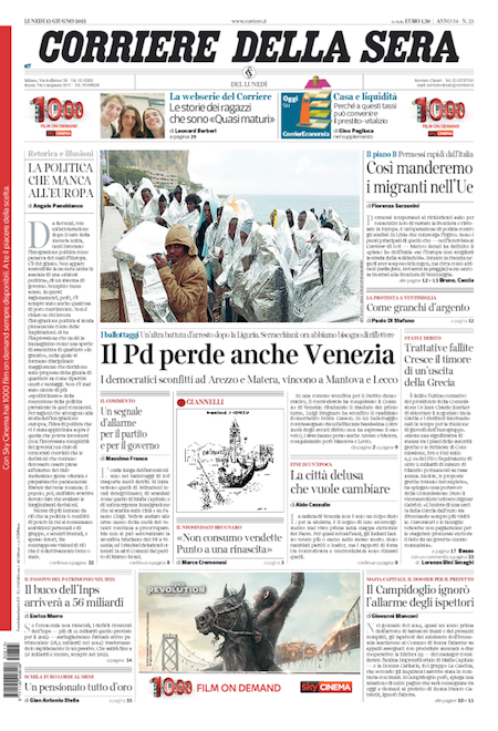 ROMA – Le prime pagine dei giornali di lunedì 15 giugno. Il Corriere della Sera: “Il Pd perde Venezia”. La Repubblica: “Pd, nuova frenata. Perduta Venezia. Renzi: una sconfitta”. La Stampa: “Migranti, scontro con Parigi. Si lavora a un piano rimpatri”.