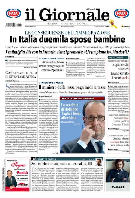 Il Secolo XIX: “La Francia respinge l’Italia”. Il Messaggero: “Profughi, contromossa italiana”. Il Tempo: “Le moschee di Roma non accettano profughi: anche loro non li vogliono”. Il Giornale: “In Italia duemila spose bambine”.
