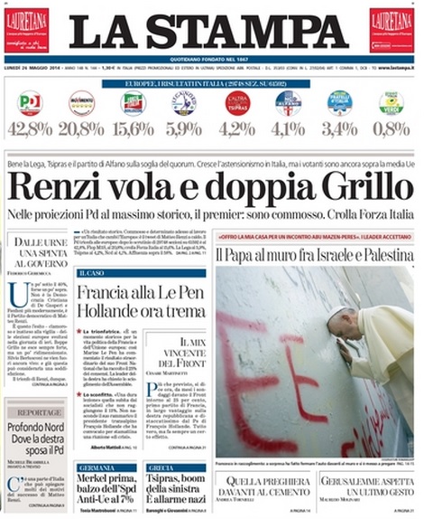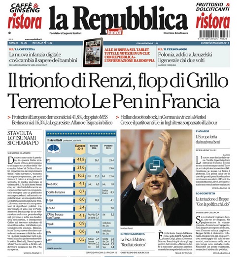 La Repubblica: “Il trionfo di Renzi, flop di Grillo. Terremoto Le Pen in Francia”.