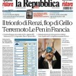 La Repubblica: “Il trionfo di Renzi, flop di Grillo. Terremoto Le Pen in Francia”.
