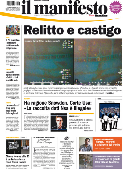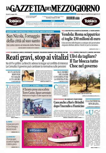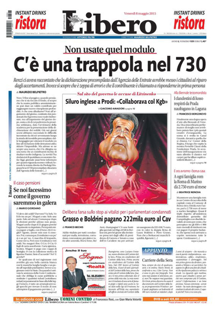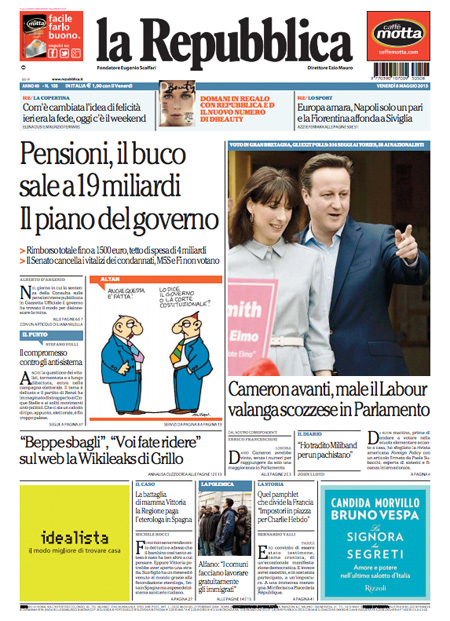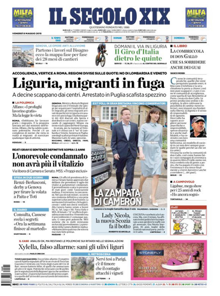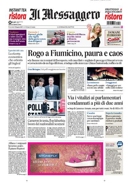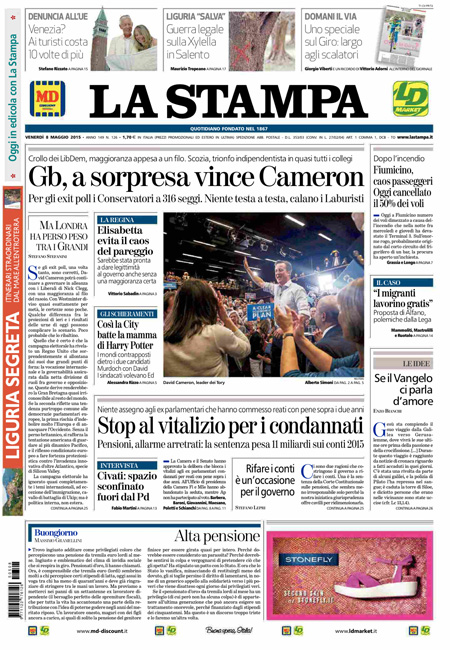 ROMA – Sono varie le aperture dei giornali di oggi, 8 maggio: si va dai risultati delle elezioni in Gran Bretagna alla decisione del Parlamento di abolire i vitalizi per i condannati definitivi con pena superiore ai due anni, all’incendio all’aeroporto di Fiumicino, alle notizie sull’immigrazione, con il ritrovamento di una nave affondata al largo della Libia e le parole di Alfano che ha proposto di far lavorare gratis i profughi, e ancora ai conti sulle pensioni.