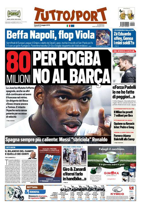I giornali sportivi presentano la 35esima giornata di campionato che si aprirà domani con gli anticipi Juve-Cagliari e Milan-Roma e danno ampio spazio alle semifinali di Europa League, giocate ieri sera, che hanno visto la pesante sconfitta della Fiorentina a Siviglia (0-3) e il pareggio al San Paolo del Napoli col Dnipro.