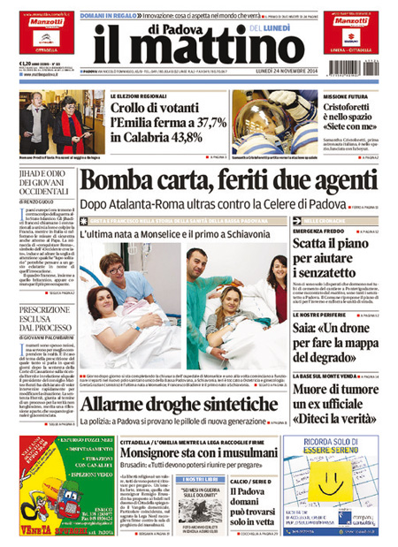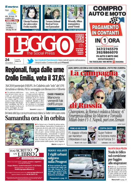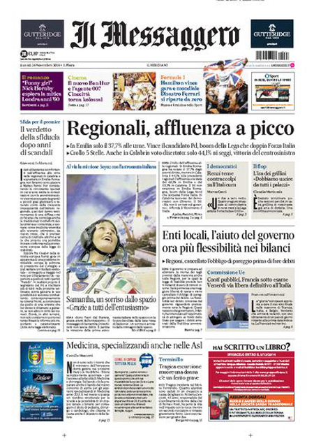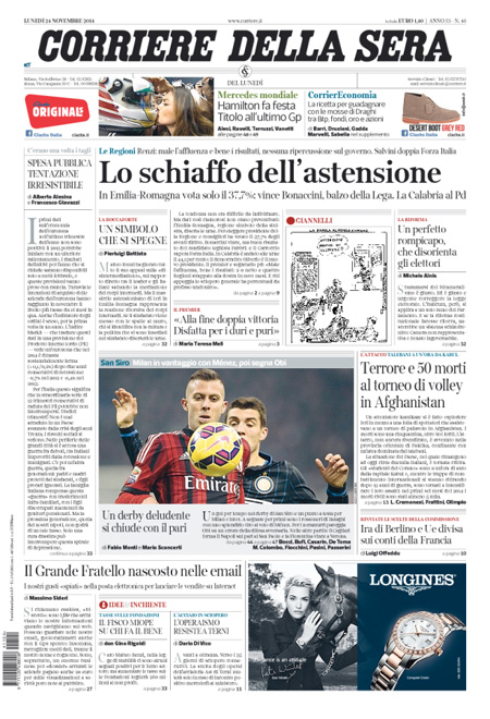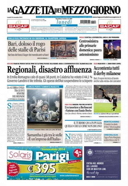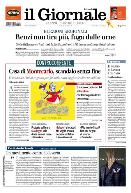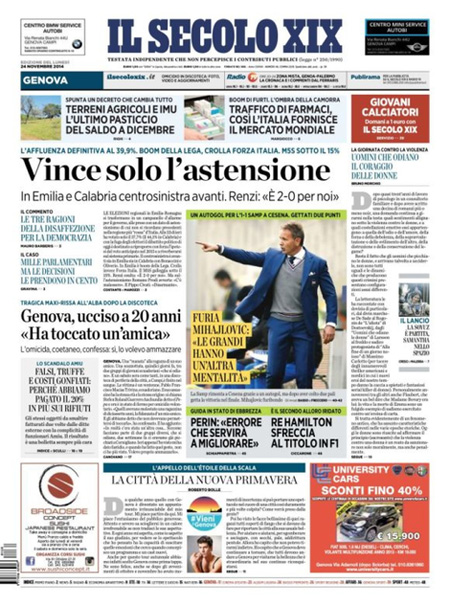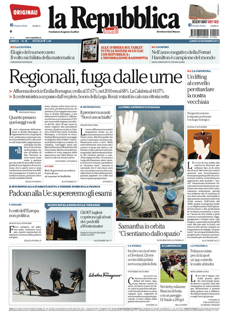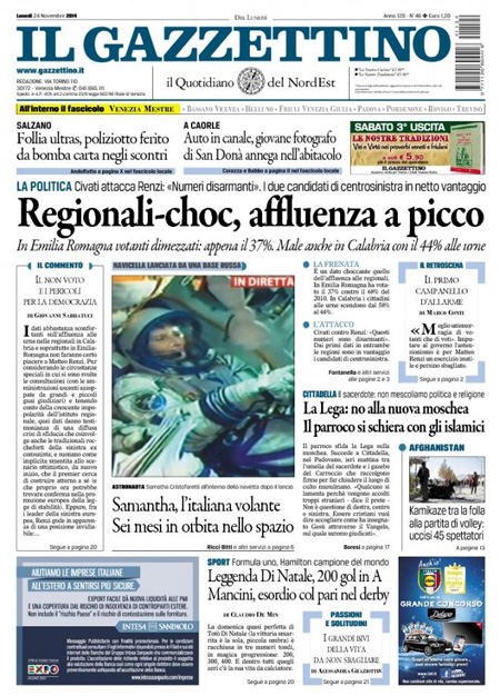 Elezioni Regionali, Matteo Renzi, Lega: le prime pagine dei giornali di lunedì 24 novembre 2014. Queste tutte le prime pagine dopo il voto delle elezioni regionali. La Stampa titola: “Crolla il voto alle Regionali. Avviso a Renzi”. Il Corriere della Sera: “Lo schiaffo dell’astensione”. La Repubblica: “Regionali, fuga dalle urne”. Stesso titolo per Il Giornale diretto da Alessandro Sallusti: “Renzi non tira più, fuga dalle urne”. Il Fatto Quotidiano: “Mafie, dalla coppola al selfie”.