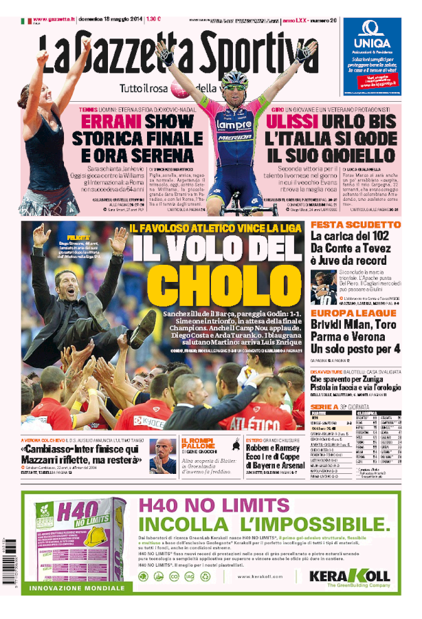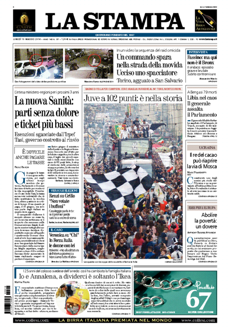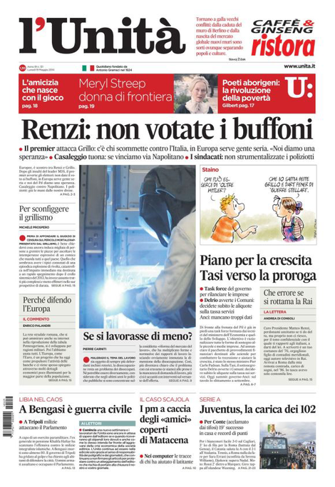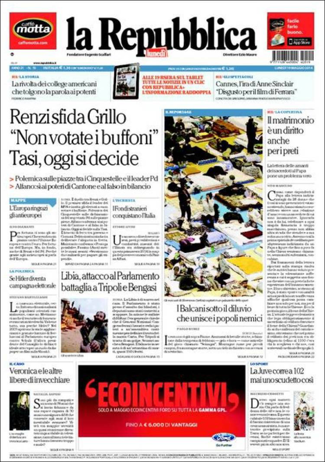 La prima pagina de La Repubblica: “Renzi sfida Grillo: non votate buffoni. Tasi, oggi si decide”.