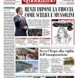 ROMA – La decisione del governo Renzi di chiedere la fiducia per il voto della Camera sulla riforma elettorale, fra le proteste delle opposizioni, e la spaccatura con la minoranza del Pd è la notizia di apertura su tutti i giornali di oggi, mercoledì 29 aprile.
