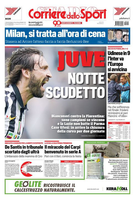 I quotidiani sportivi presentano la giornata di campionato di stasera, che è iniziata ieri con l’anticipo vinto dall’Inter sul campo dell’Udinese, che potrebbe dare alla Juventus la certezza della vittoria dello scudetto. Spazio anche alla storica promozione in serie A del Carpi.