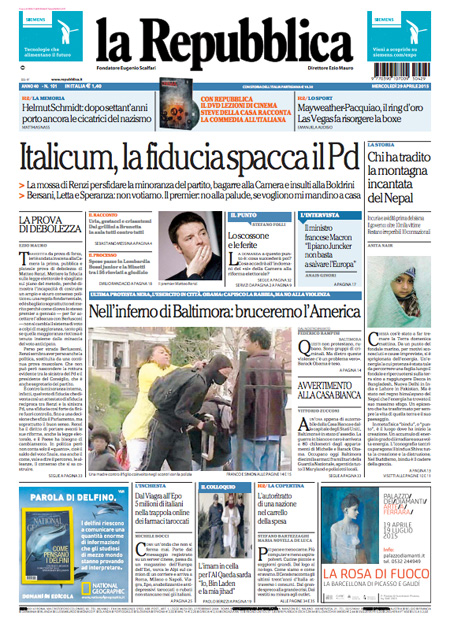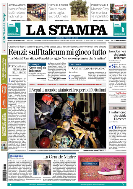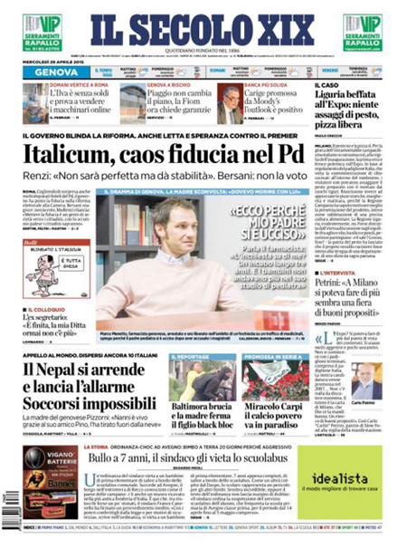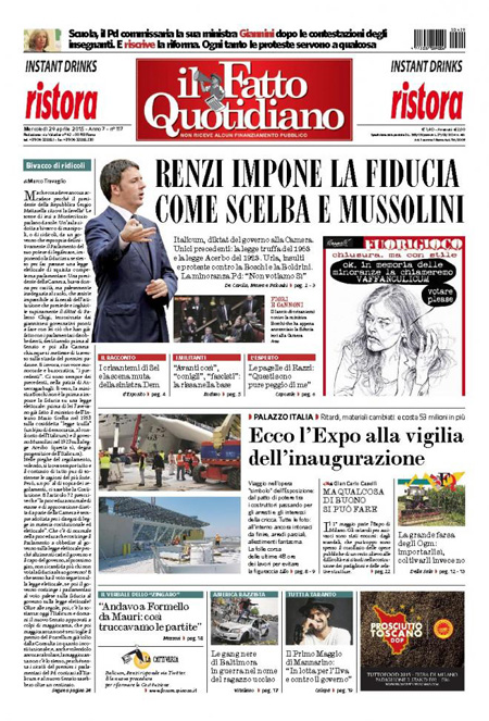 ROMA – La decisione del governo Renzi di chiedere la fiducia per il voto della Camera sulla riforma elettorale, fra le proteste delle opposizioni, e la spaccatura con la minoranza del Pd è la notizia di apertura su tutti i giornali di oggi, mercoledì 29 aprile.