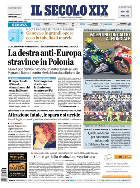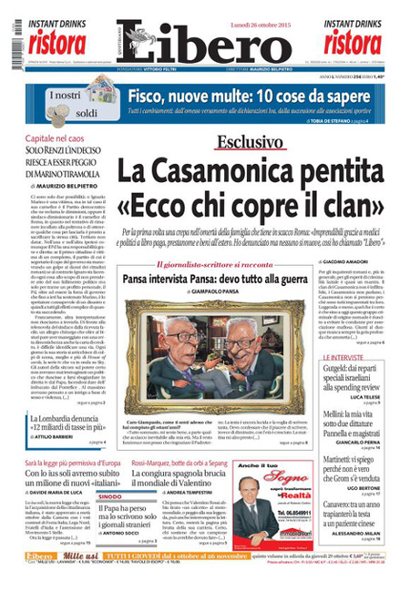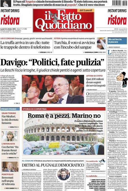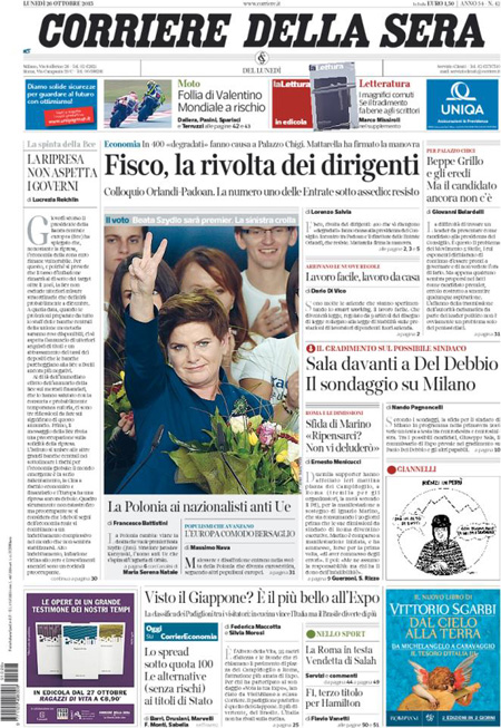 ROMA – Le prime pagine dei giornali di lunedรฌ 26 ottobre. Il Corriere della Sera: “Fisco, la rivolta dei dirigenti. Colloquio Orlando-Padoan. La numero uno delle Entrate sotto assedio: resisto”. La prima pagina della Repubblica: “Il piano di Marino per restare sindaco. Scontro con il Pd. Il primo cittadino ai manifestanti: non vi deluderรฒ. Mattarella firma la manovra: 4 miliardi di tagli alle tasse”. La prima pagina del Sole 24 Ore: “Fisco, ecco chi risparmia con la mini-tassa a forfait”.
