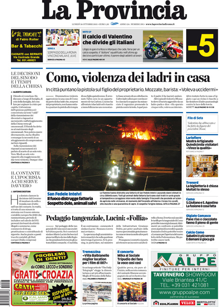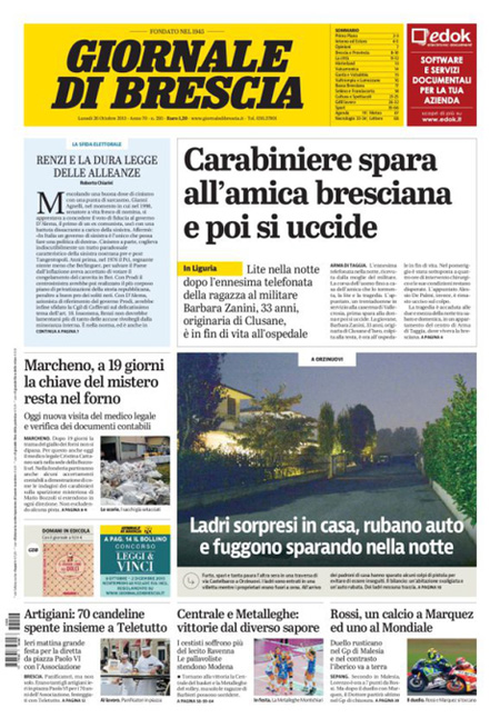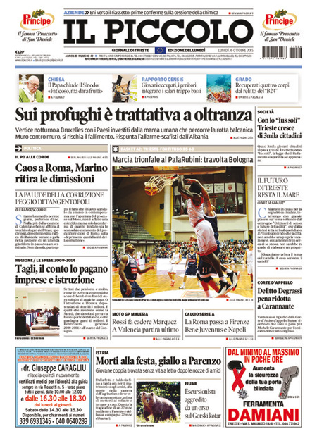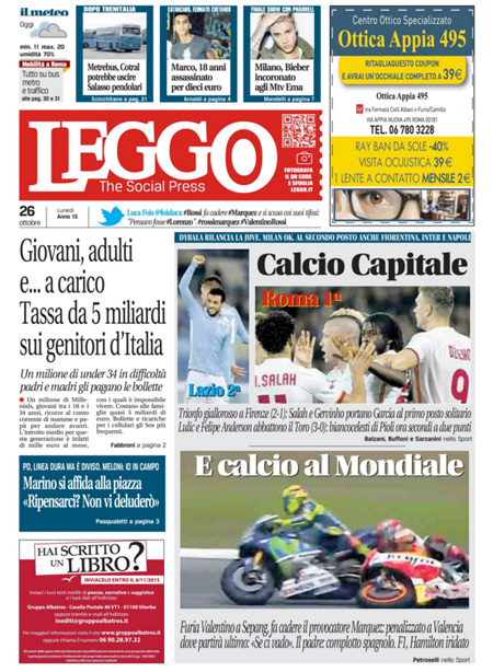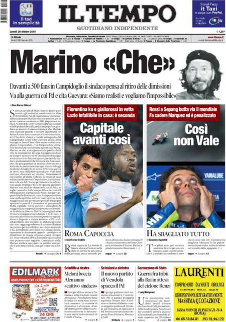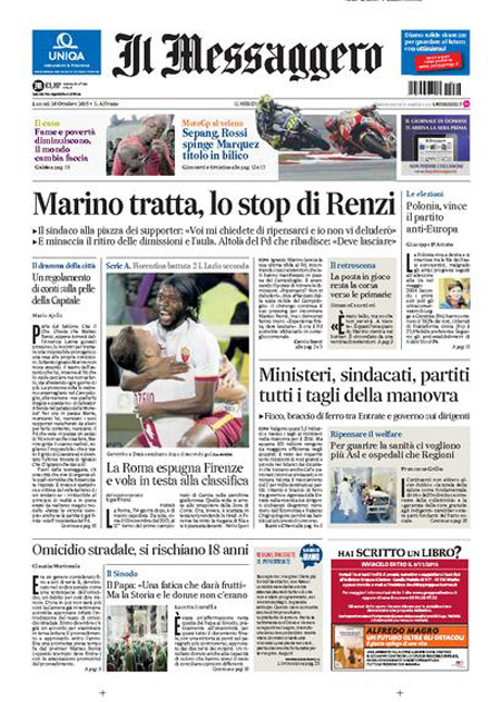 La prima pagina del Messaggero: “Marino tratta, lo stop di Renzi. Il sindaco alla piazza dei supporter: voi mi chiedete di ripensarci e io non vi deluderรฒ. E minaccia il ritiro delle dimissioni”. Il Giornale: “Parla il pensionato simbolo: perchรฉ ho sparato al ladro”. L’Unitร : “E ora tocca alle Regioni. La stagione delle riforme non si ferma. Dopo il Senato una mozione dร il via libera all’iter per ridurle a 12. Le macro regioni possono eliminare burocrazie e sprechi e migliorare i servizi ai cittadini”. Libero: “La Casamonica pentita: ecco chi copre il clan”. Il Tempo: “Marino che. Davanti a 500 fans in Campidoglio il sindaco pensa al ritiro delle dimissioni. Va alla guerra con il Pd e cita Guevara: siamo realisti e vogliamo l’impossibile”. Queste le prime pagine dei giornali di lunedรฌ 26 ottobre.