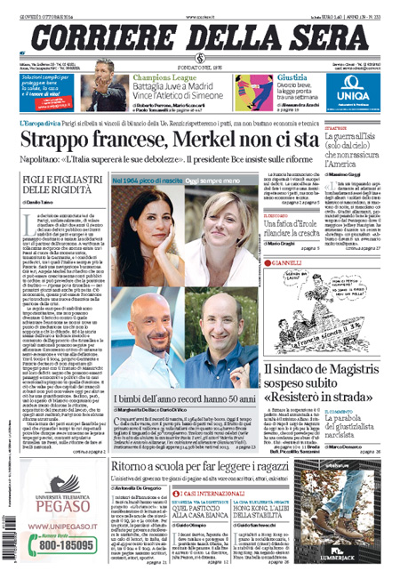 Il Corriere della Sera: “Strappo francese, Merkel non ci sta”. Figli e figliastri della rigidità, editoriale di Danilo Taino: