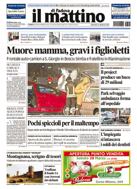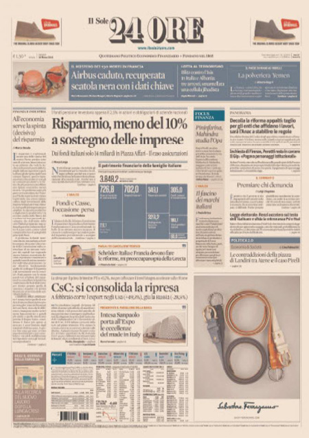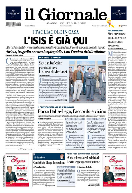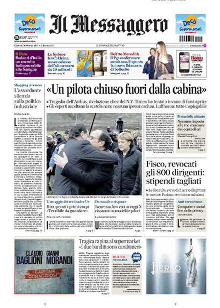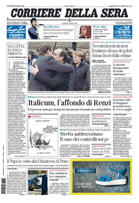 ROMA – Le prime pagine dei giornali di giovedì 26 marzo. La Stampa: “Il dolore e i dubbi sulla sicurezza”. Il Corriere della Sera: “Italicum, l’affondo di Renzi”. La Repubblica: “Intercettazioni, la stretta del governo”. Il Messaggero: “Un pilota chiuso fuori dalla cabina”.