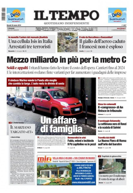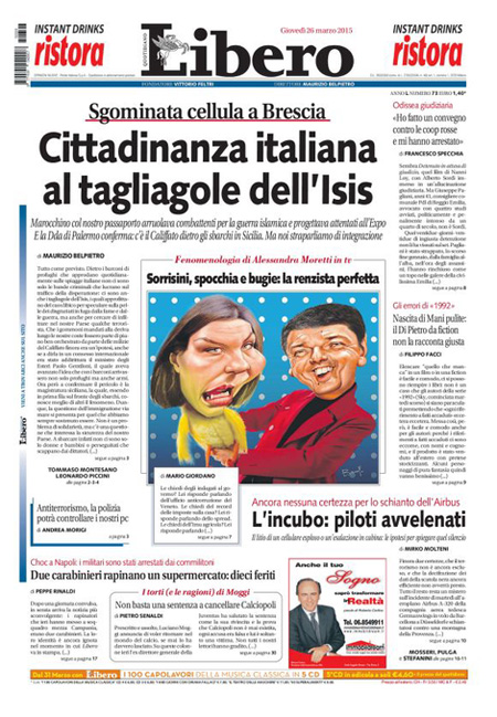 Il Giornale: “I tagliagole in casa. L’Isis è già qui”. Il Fatto Quotidiano: “Ci frugano nella email con la scusa dell’Isis”. Libero: “Cittadinanza italiana al tagliagole dell’Isis”.