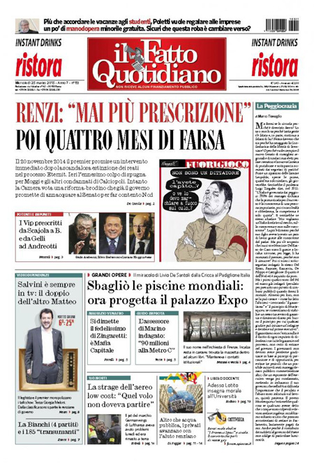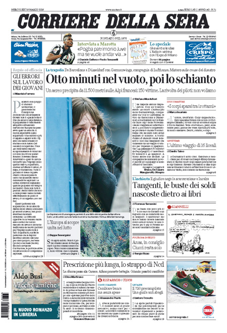 Il Messaggero: “Airbus, i misteri dello schianto”. Il Giornale: “Ingiustizia è fatta. Processati a vita”. Il Fatto Quotidiano: “Renzi: mai più prescrizioni. Poi quattro mesi di farsa”. Libero: “I misteri dell’aereo caduto”.