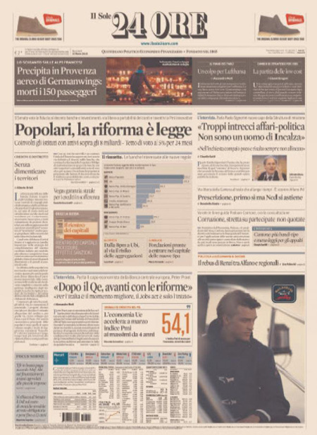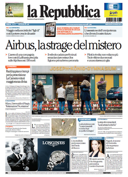 ROMA – Le prime pagine dei giornali di mercoledì 25 marzo. La Stampa: “Il mistero dell’airbus precipitato”. Il Corriere della Sera: “Otto minuti nel vuoto, poi lo schianto”. La Repubblica: “Airbus, la strage del mistero”.