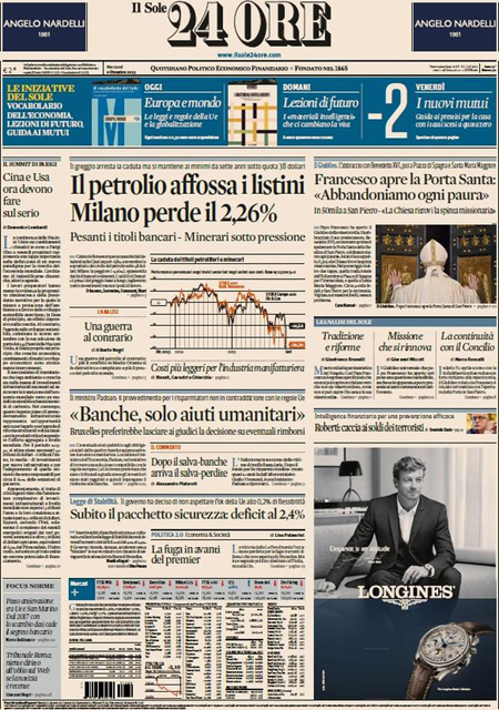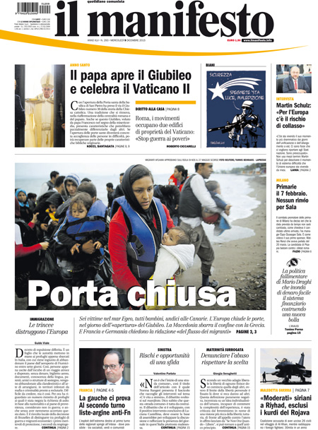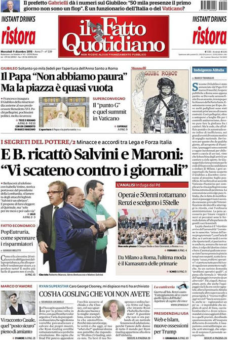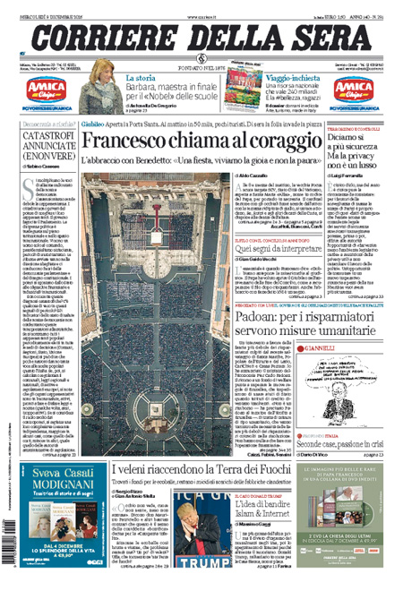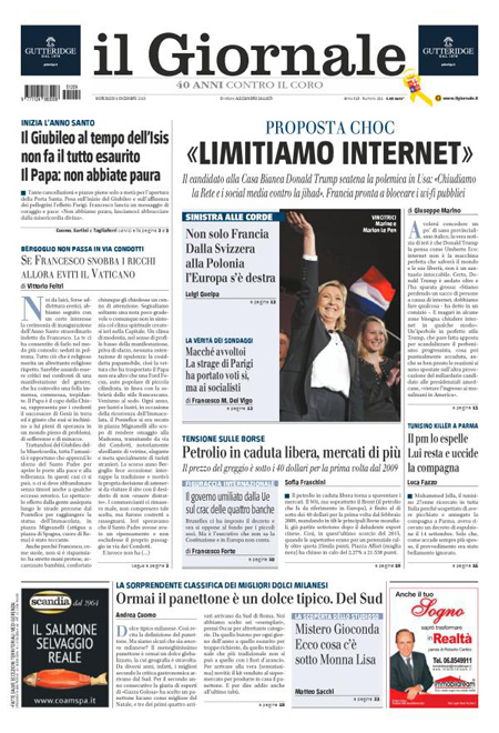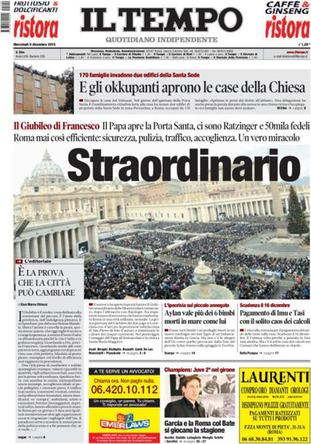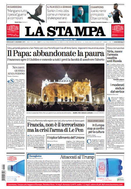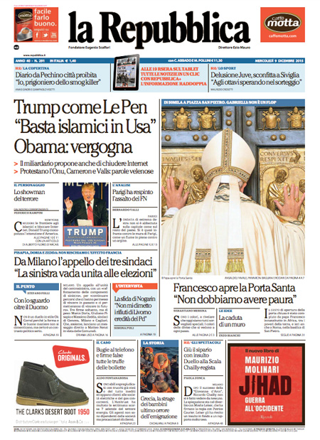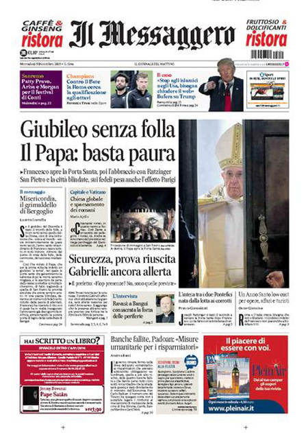 ROMA – L’inizio del Giubileo straordinario della misericordia indetto da Papa Francesco con l’apertura della porta santa nella basilica di San Pietro è la notizia di apertura su quasi tutti i giornali di oggi, mercoledì 9 dicembre. Repubblica e il Giornale invece titolano sulle proposte del candidato alla presidenza degli Stati Uniti Donald Trump di chiudere gli Stati Uniti agli islamici e di limitare l’accesso a internet contro il terrorismo.