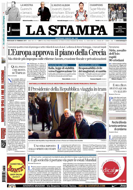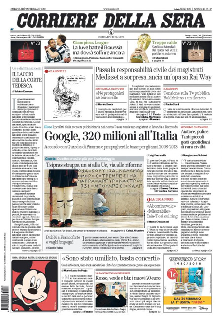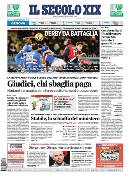 ROMA – Le prime pagina di mercoledì 25 febbraio. La Stampa: “L’Europa approva il piano della Grecia”. Il Corriere della Sera: “Google, 320 milioni all’Italia”. La Repubblica: “Giudici, chi sbaglia paga. Scatta la nuova legge. L’Anm: è contro di noi”.