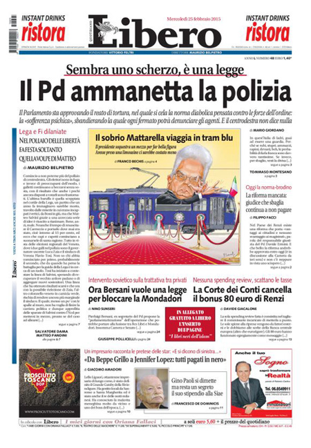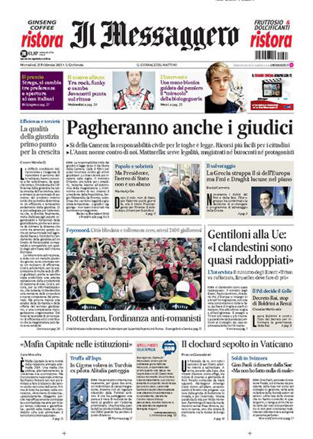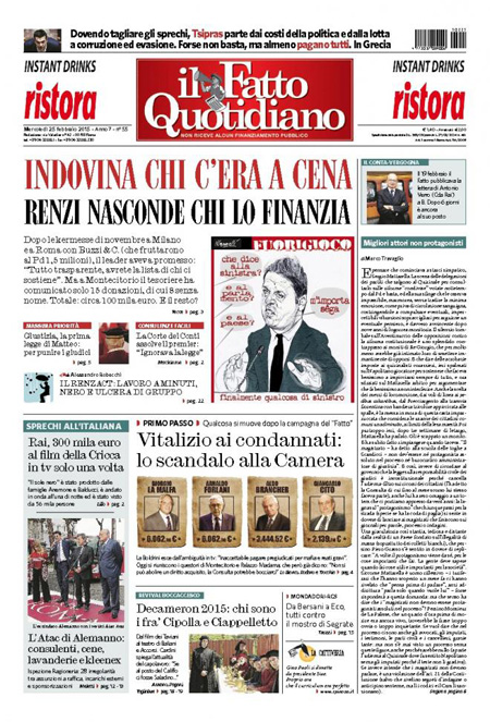 Il Sole 24 Ore: “Sì dell’Europa al piano di Atene”. Il Messaggero: “Pagheranno anche i giudici”. Il Giornale: “Nostalgia comunista. Il Pd riesuma i Soviet”. Il Fatto Quotidiano: “Indovina chi c’era a cena. Renzi nasconde i finanziatori”. Libero: “Il Pd ammanetta la polizia”.