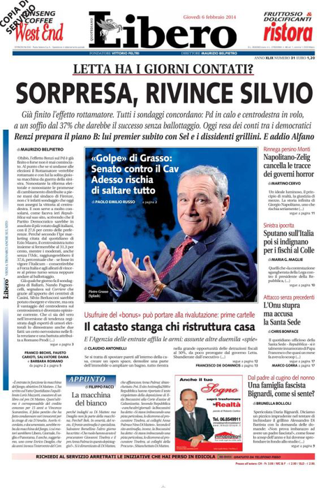 Vuoi vedere che non era cosรฌ folle soยญstenere- come hanno fatto di recenยญte i grillini – che il Paese sta finendo nelle mani dei boia? Ieri il procuratoยญre a vita Grasso, presidente del Senato, non ce lโha fatta a resistere alla tentazione. Sembraยญva, dopo che il consiglio di presidenza del Seยญnato aveva votato no, che Palazzo Madama non potesse costituirsi parte civile contro Berยญlusconi per la presunta corruzione di senatoยญri. Non scherziamo. Il leader di Forza Italia va combattuto in ogni modo,troppo forte divenยญta lโasse tra lui e Renzi, cosรฌ troppa gente perde la propria ragione sociale. Allora ci ha pensaยญto Grasso, ed รจ impensabile che lโabbia fatto senza consultare Napolitano e aver avuto il suo via libera. Parte civile sia. ร la prima volta nella storia che il Senato fa una scelta del geneยญre. Sarebbe bello sapere anche cosa ne pensa di questa storia il fu delfino Alfano, che espriยญme solidarietร a parole, ma poi se ne lava le mani quando servono gesti concreti. ร ancora disponibile a sostenere questa maggioranza? Si sente a suo agio in questo governo delle larยญghe intese? Disintossicatevi.