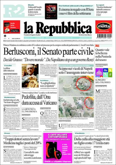 La prima pagina di Repubblica: “Berlusconi, il Senato parte civile”.